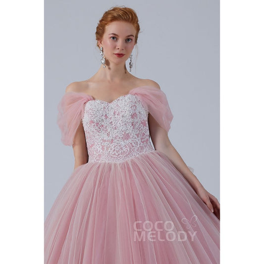 CW2155 プリンセス オフショルダー リボン レースアップリケ ビーズ ピンク カラードレス 【結婚式 カラードレス オーダーメイド】