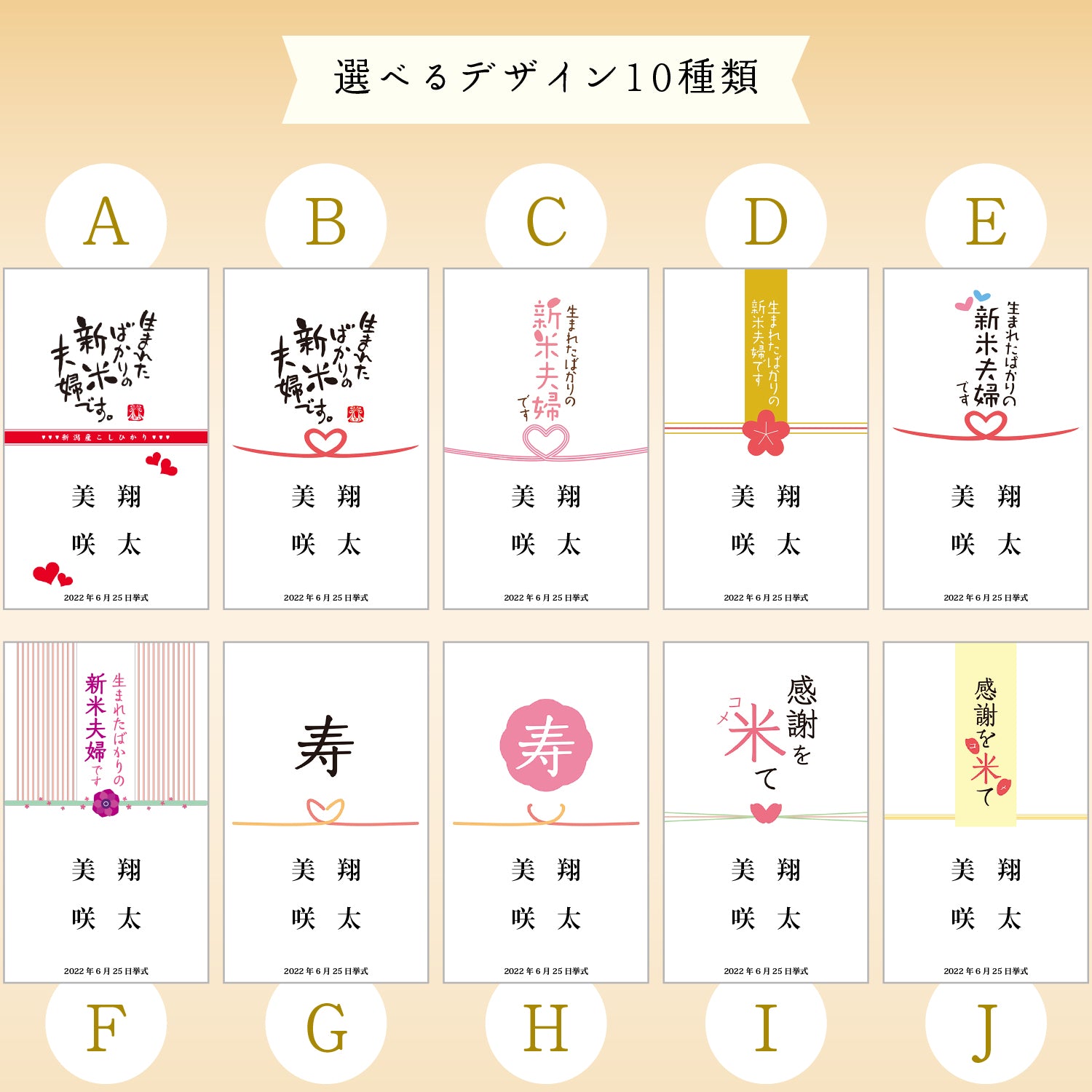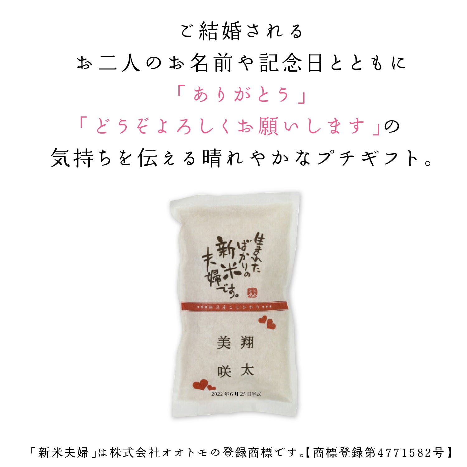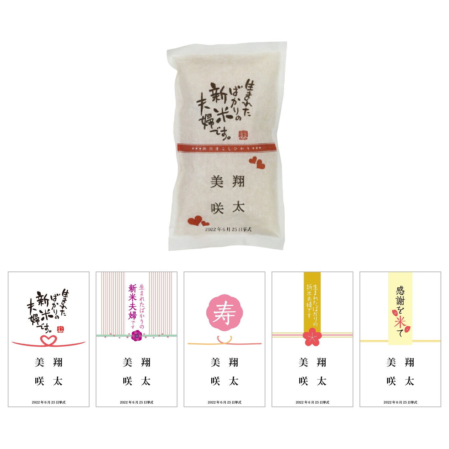 「新米夫婦」「寿」「感謝を米(コメ)て」の文字とともに、ご結婚されるお二人のお名前を入れて「ありがとう」や「どうぞよろしくお願いします」の気持ちを伝える、晴れやかなプチギフトです。