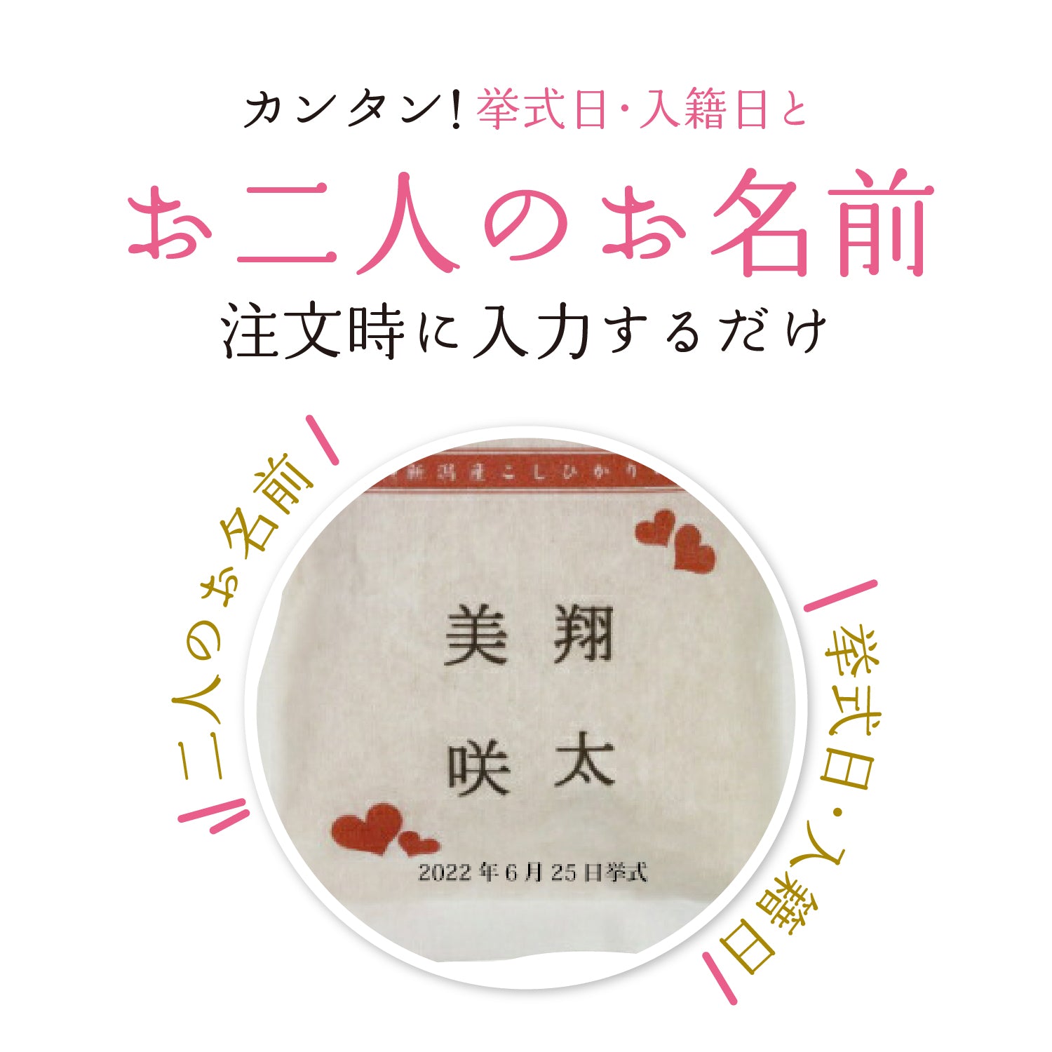 結婚式の引出物・内祝いプチギフトに、名前や記念日が入れられるコシヒカリ300gのギフト。