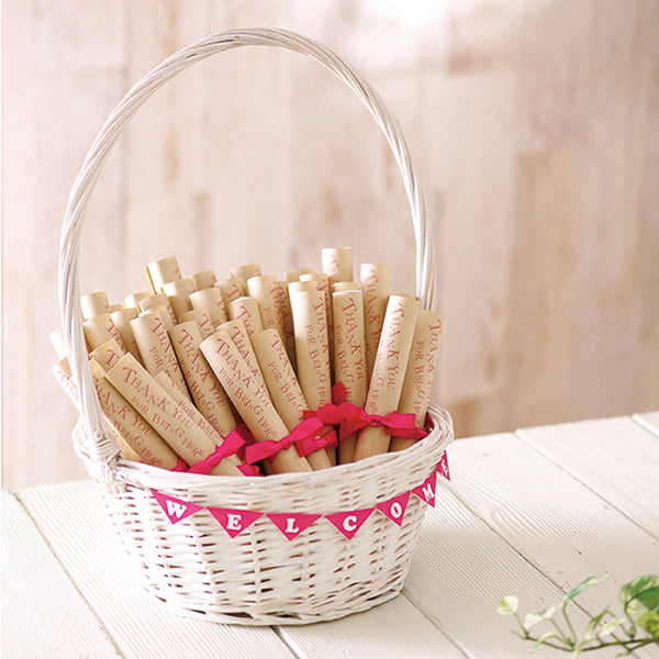 鮮やかなピンクのリボンとガーランドで彩られたバスケットでゲストの皆さまをお出迎え。