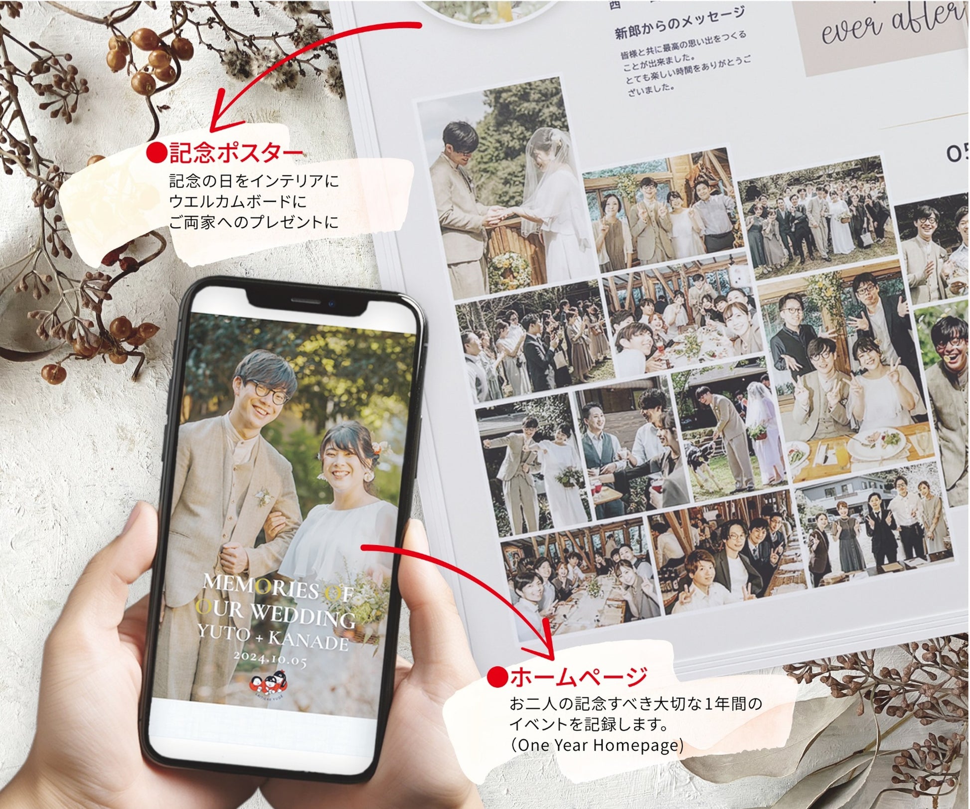 ・披露宴、前撮りから始まる新婚生活1年間の「はじめての日」を記録します。
