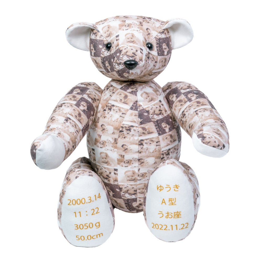 新郎新婦が生まれたときの体重と同じ重さで作り、思い出の詰まったお写真をベア全面にプリントした世界に1つだけのぬいぐるみ。