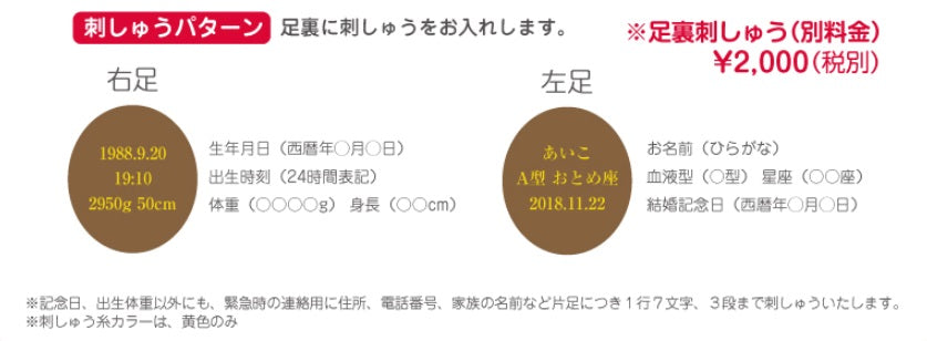 ☆足裏に、記念日や出生体重、緊急時の連絡先等、片足につき1行7文字、3段まで刺しゅうをお入れできます。