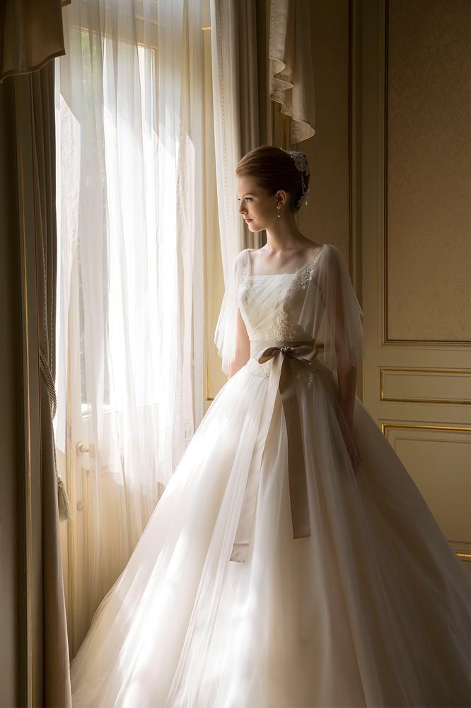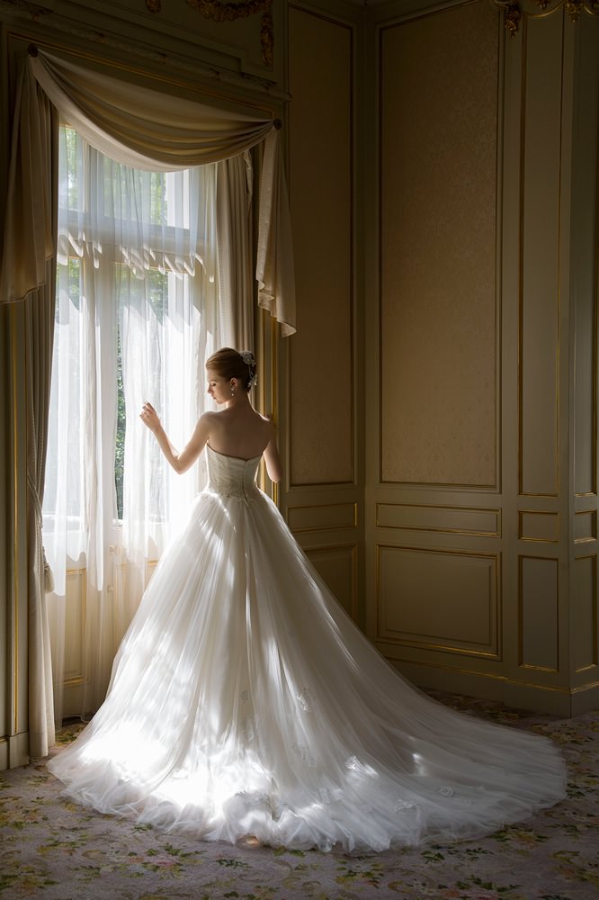 イタリア製級のチュールを全体に使い、トレーンには、斜めに立ち上がったフランスのリバーレースを使用。スカートに華やかさを出してくれています。