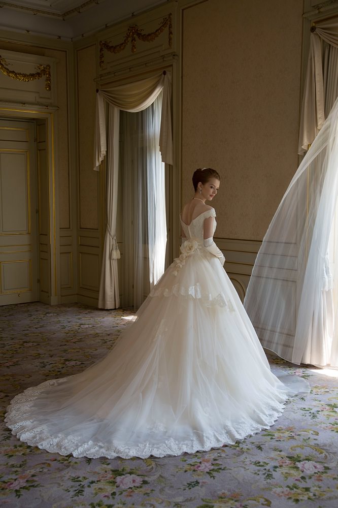 ボリュームのあるAラインスカートにヒップラインが中世ヨーロッパ風のバッスルライン見頃が上品なオフショルダードレス。