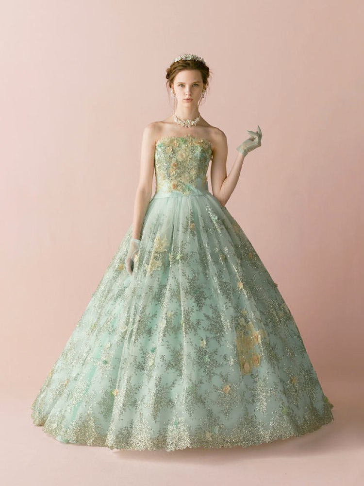 ペパーミントグリーンの色味に美しく輝くグリッターが上品な一着。 立体的なお花が所々に施され、ガーリーさもプラス。最高の結婚式にするためにこだわり続けるプリンセスガーデン。