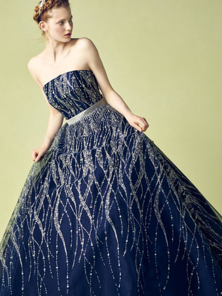 美しく広がるチュールのスカートに流れるようにグリッターラメが輝く。 落ち着いた色味で上品な印象に。最高の結婚式にするためにこだわり続けるプリンセスガーデン。
