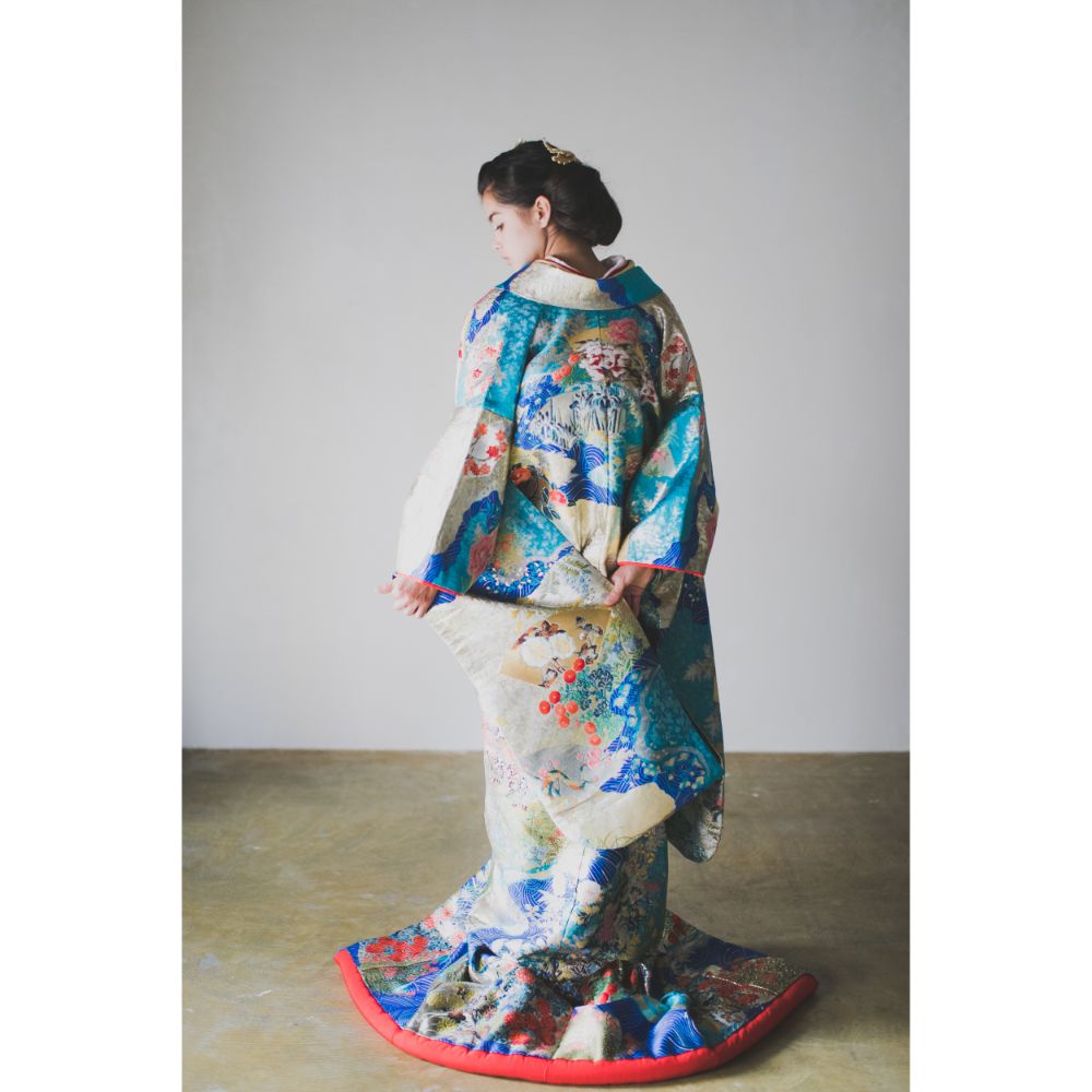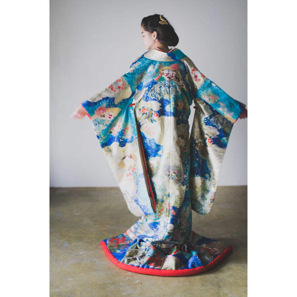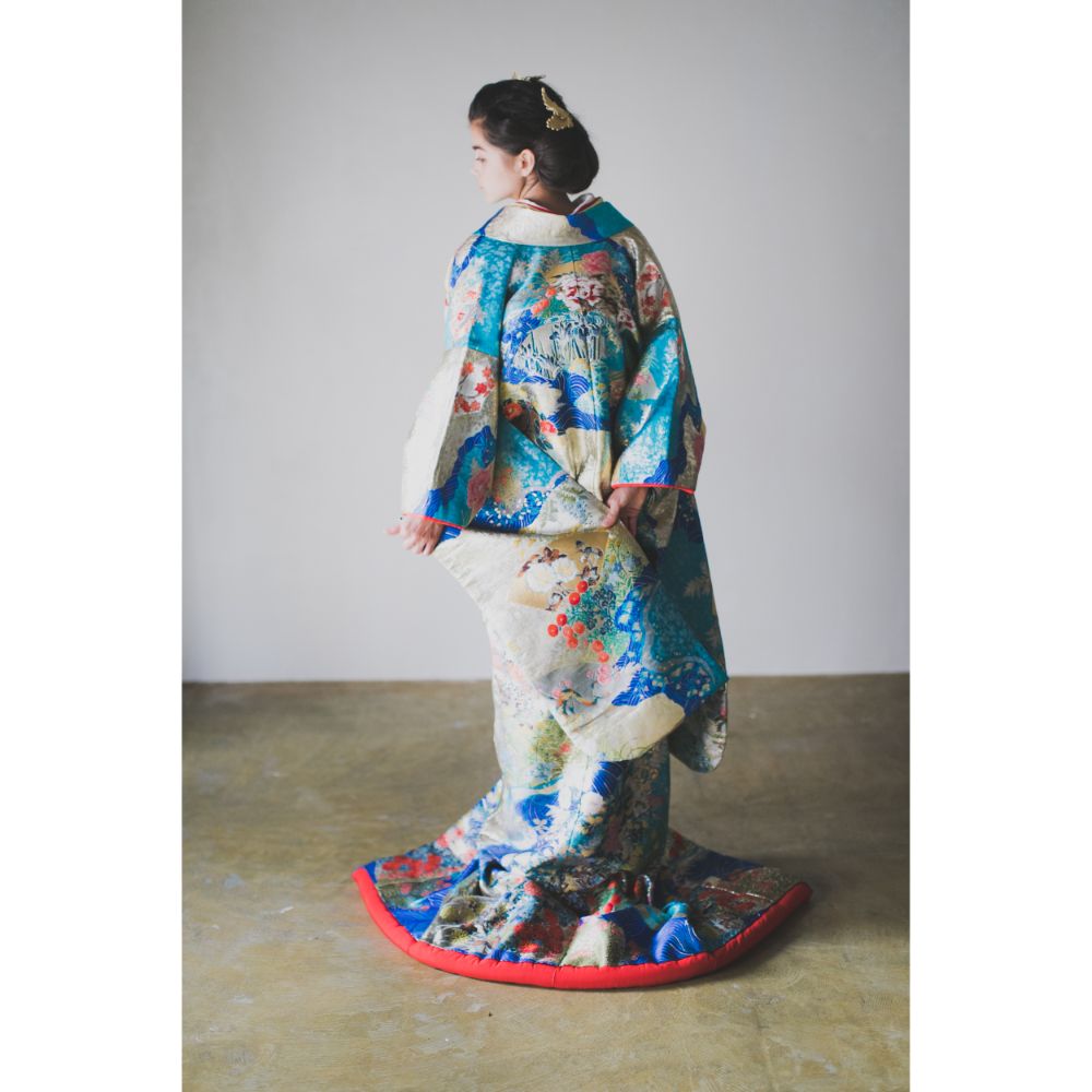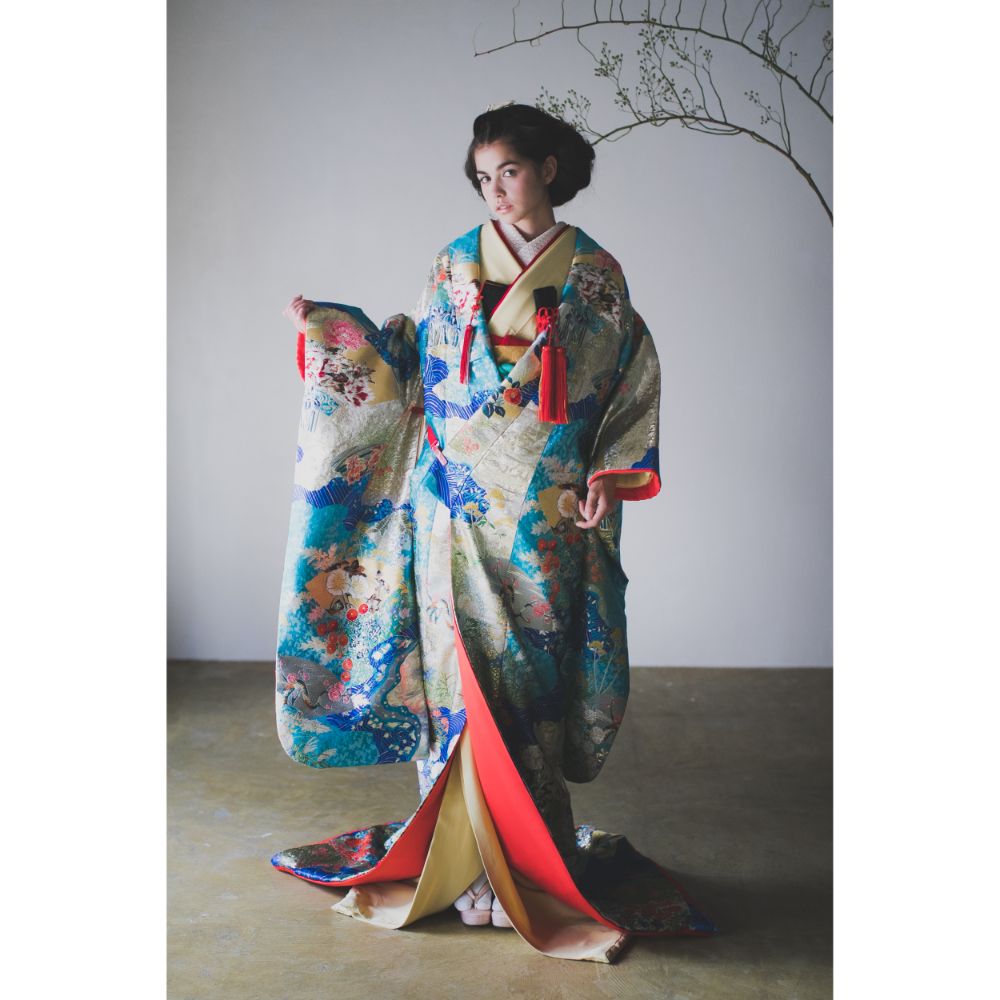青海波の模様には波のように途切れることなく続く穏やかな生活への願いが込められており、これからの末永い幸せに向けて門出を迎える花嫁さまにぴったりの一枚です。いくつもの色と柄をつなぎ合わせて創られた道長取という技法で重厚感のある気高い印象を与えてくれるこのお衣裳は大きな会場や暗めの照明の中でも映える、存在感のある一着です。