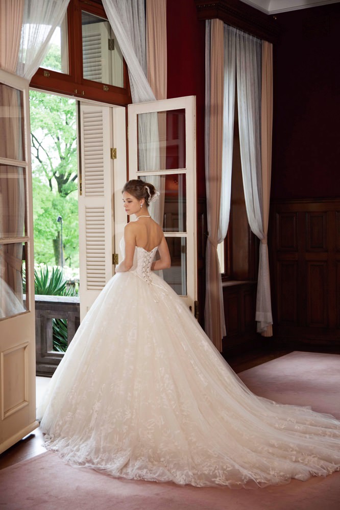 刺繍にスワロフスキーをふんだんに使い、スポットライトが当たるとキラキラと輝き、どの角度から見ても美しいドレスです。最高の結婚式にするためにこだわり続けるプリンセスガーデン。