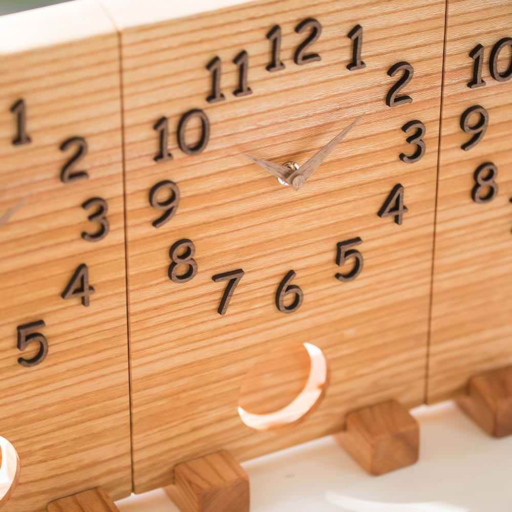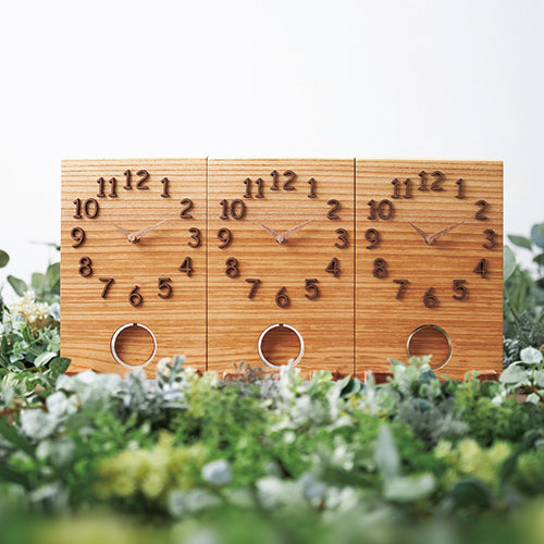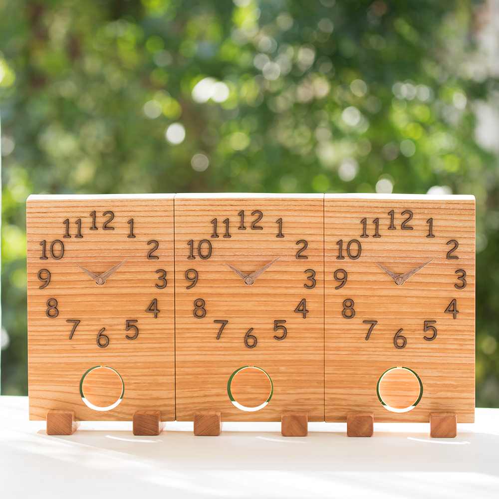 新たに家族となる新郎新婦と両家がひとつの木目でつながり、三つの家族が新しい人生の同じ時を結ぶ三連時計「Toki-musubi」(ときむすび)