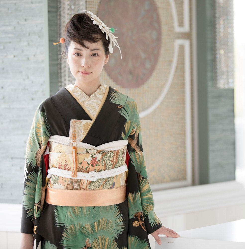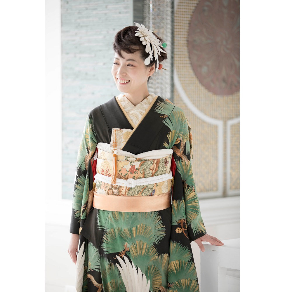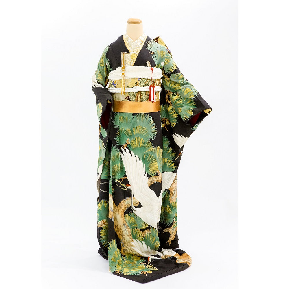 鮮やかな緑と金糸の彩りが添えられた葉をたたえた松の大木に飛翔する鶴が大胆に配された黒振袖。