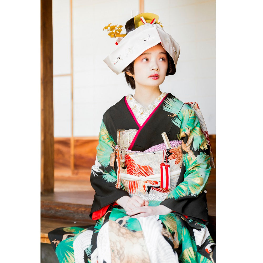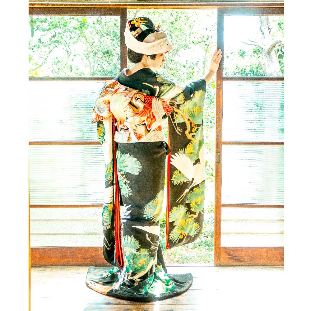 アンティーク振袖 黒地/老松総柄に鶴 【結婚式 和装 引き振袖 レンタル】