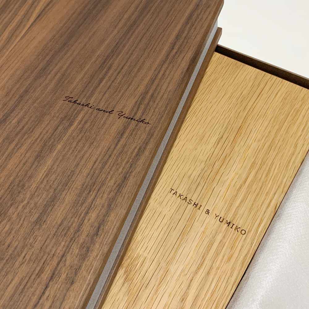 無垢材の風合いを生かして重厚感ある表紙を使用したオーダーメイドのウェディングアルバムになります。