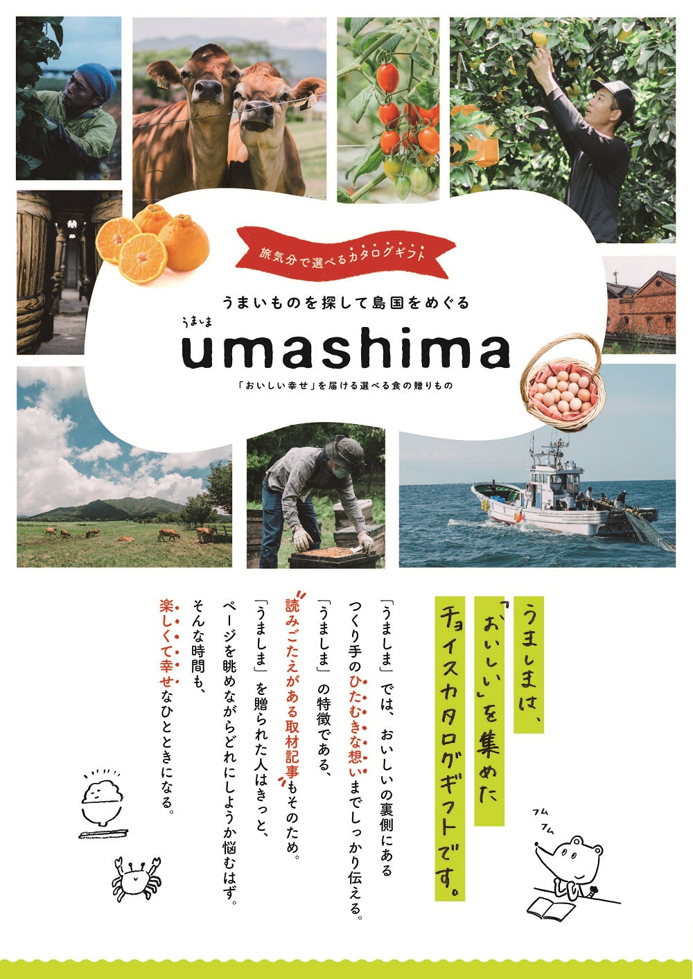 うましまは、日本のおいしいを集めた食のカタログです。(美味+安心)×想い、これが「うましま」のおいしい方程式です。「うましま」は商品が生まれるまでの「裏側」にスポットを当てて、その想いを紹介するグルメチョイスカタログです。食にこだわる方も大満足の、おいしいラインナップ。生産者の顔や考え方が見える、記事が満載のグルメカタログ。素材や環境、育て方などのこだわりを余すことなく紹介しています。すべての商品に納得しながら楽しく選べる「心にもおいしい」ギフトです。