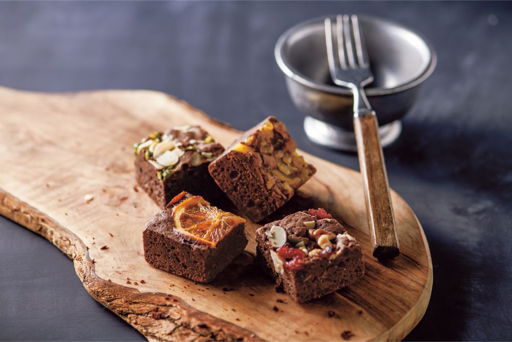 濃厚なチョコ生地に、ナッツと果物を散りばめて。封を開けると、カカオの香りがふわり。甘すぎない濃厚なチョコの味わいと、ザクザク刻んだナッツの香ばしさ、ドライフルーツの甘酸っぱさを、ひとくちサイズに焼き上げました。大人にもオススメの、ちょっと贅沢なブラウニーです。