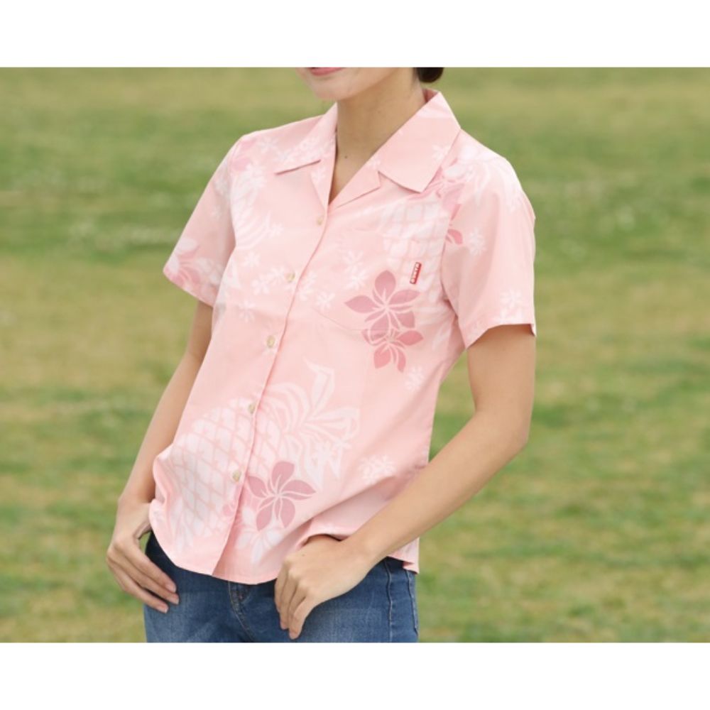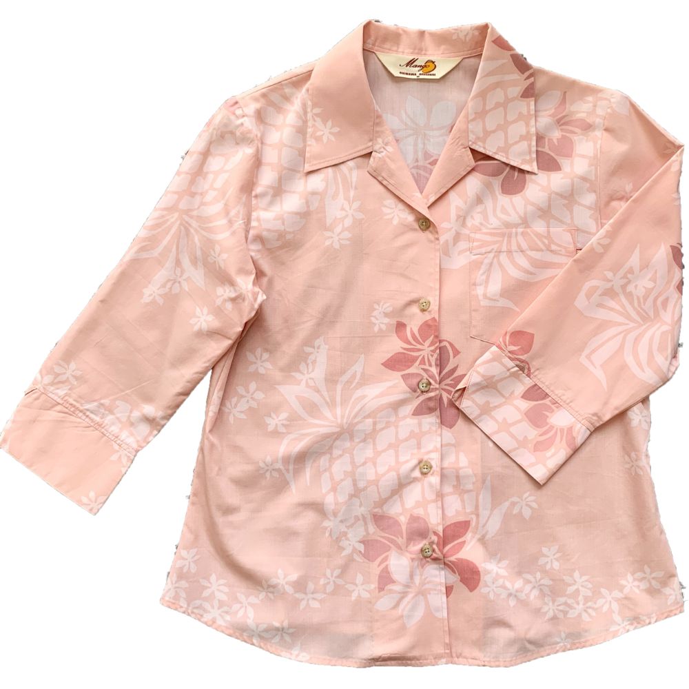 パインの大柄とプルメリアをポップに表現。南国気分をあじわえる一着!