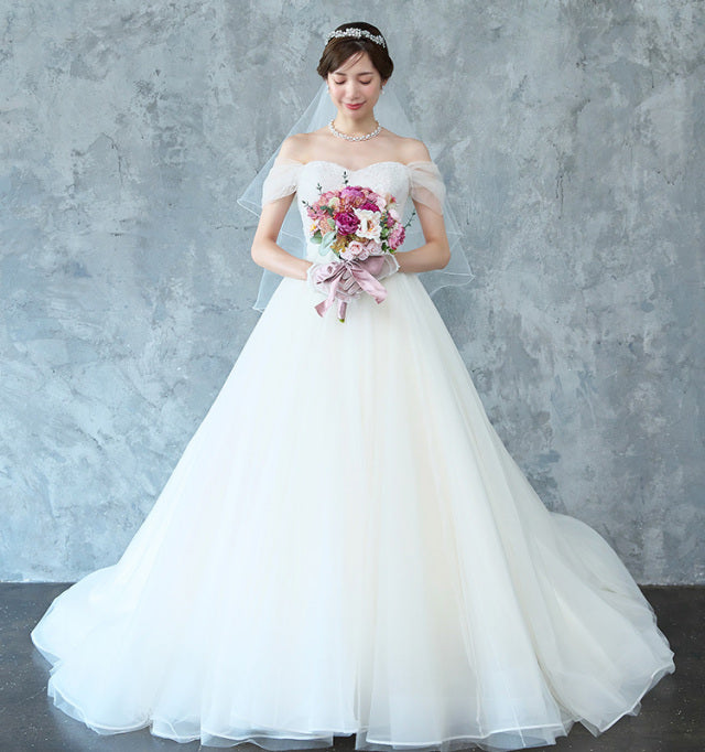 流行の低めにセットするシニョンヘアに合わせて、ベールを低い位置につけてもきれいな花嫁姿が完成します。