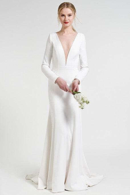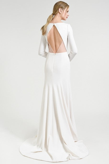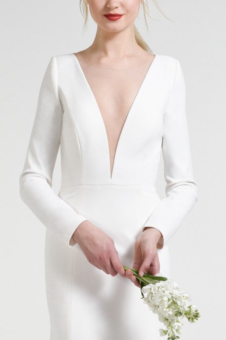 ロングスリーブ、シアーなイリュージョンチュール、バックスタイルのひし形のカットアウトは、非常にモダンでスマートな印象を与えます。