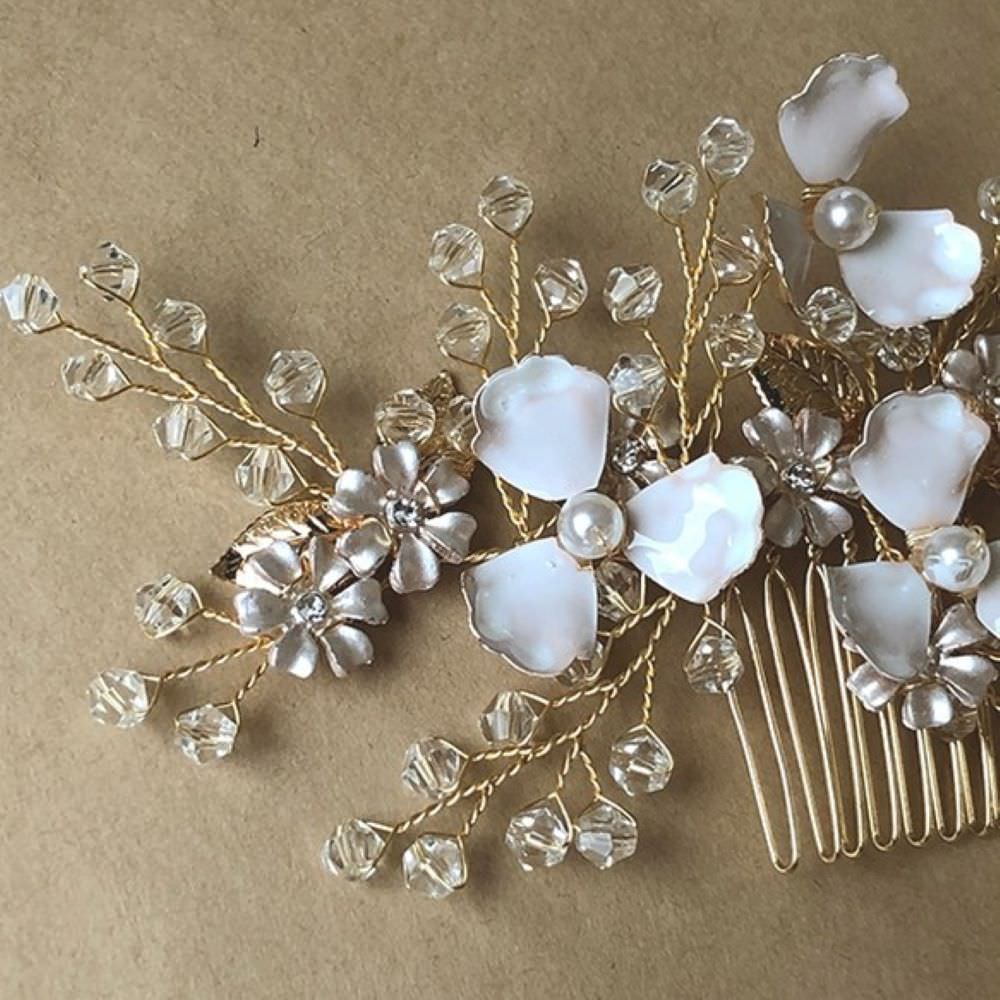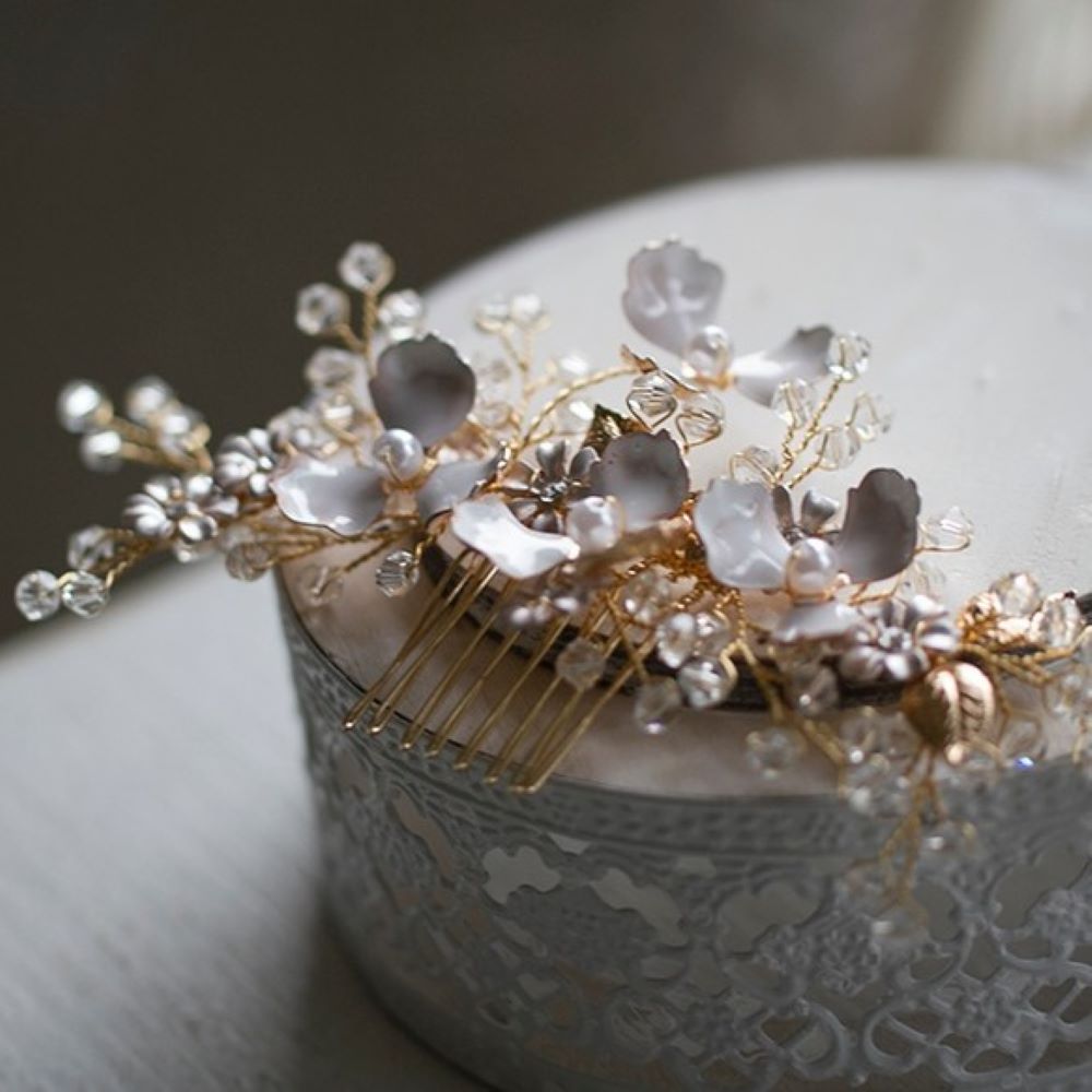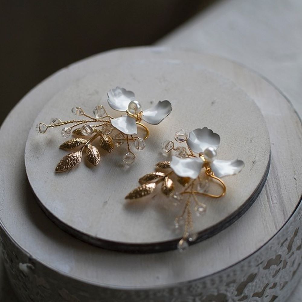 陶器のようなホワイトのお花と一緒にビーズや葉のモチーフ、ゴールドの小花をワイヤリング。