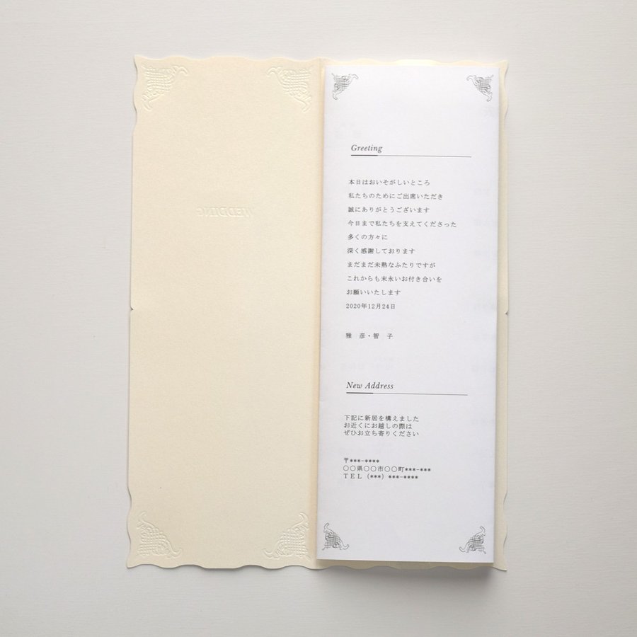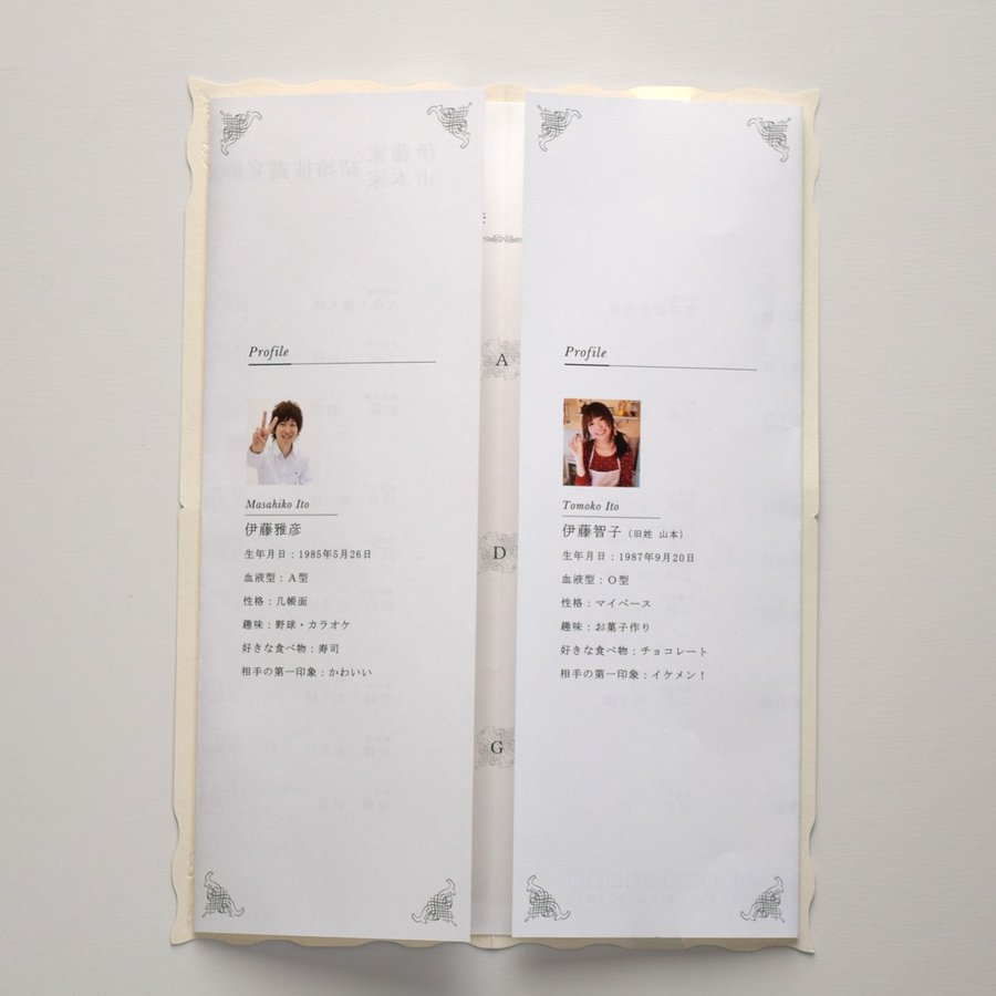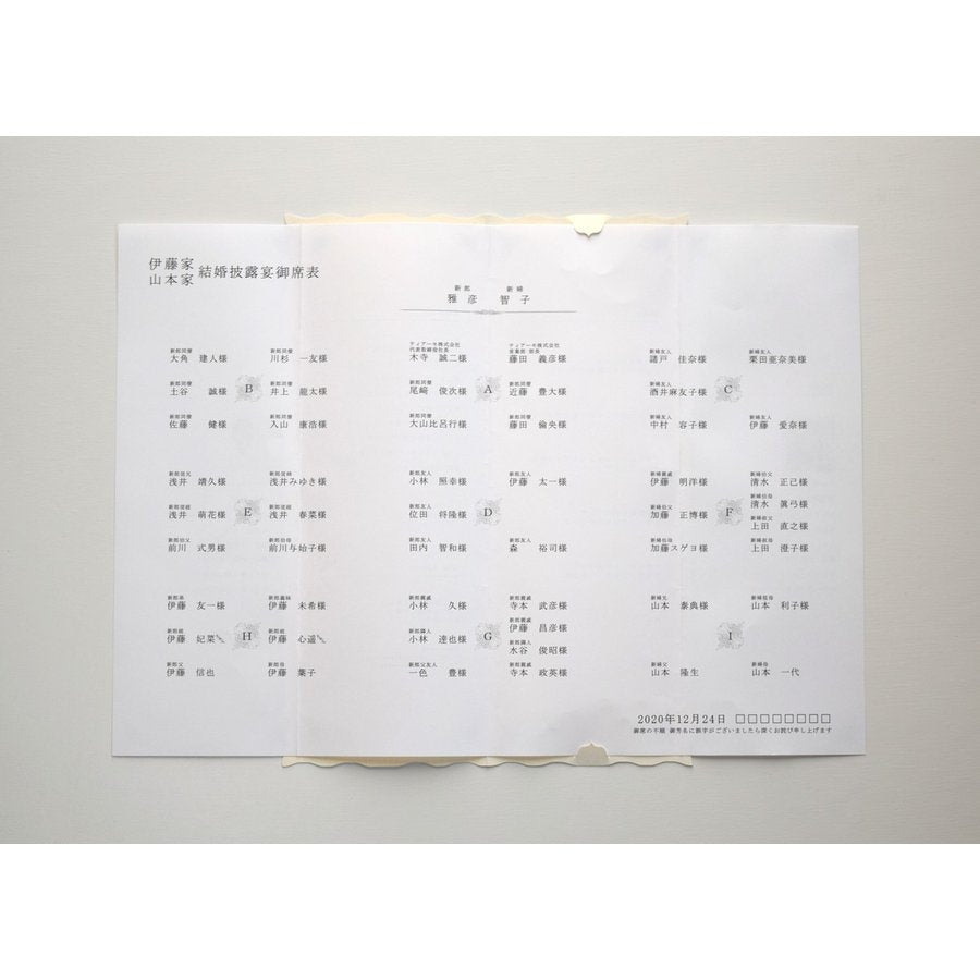 | 印刷備考 | 表面…席次表 裏面…挨拶・新居案内・メニュー・プロフィール(写真有) |