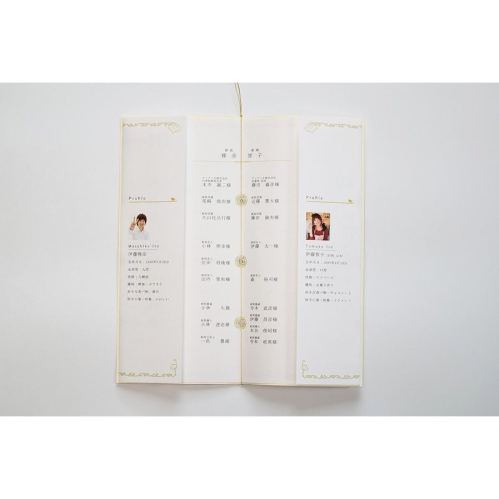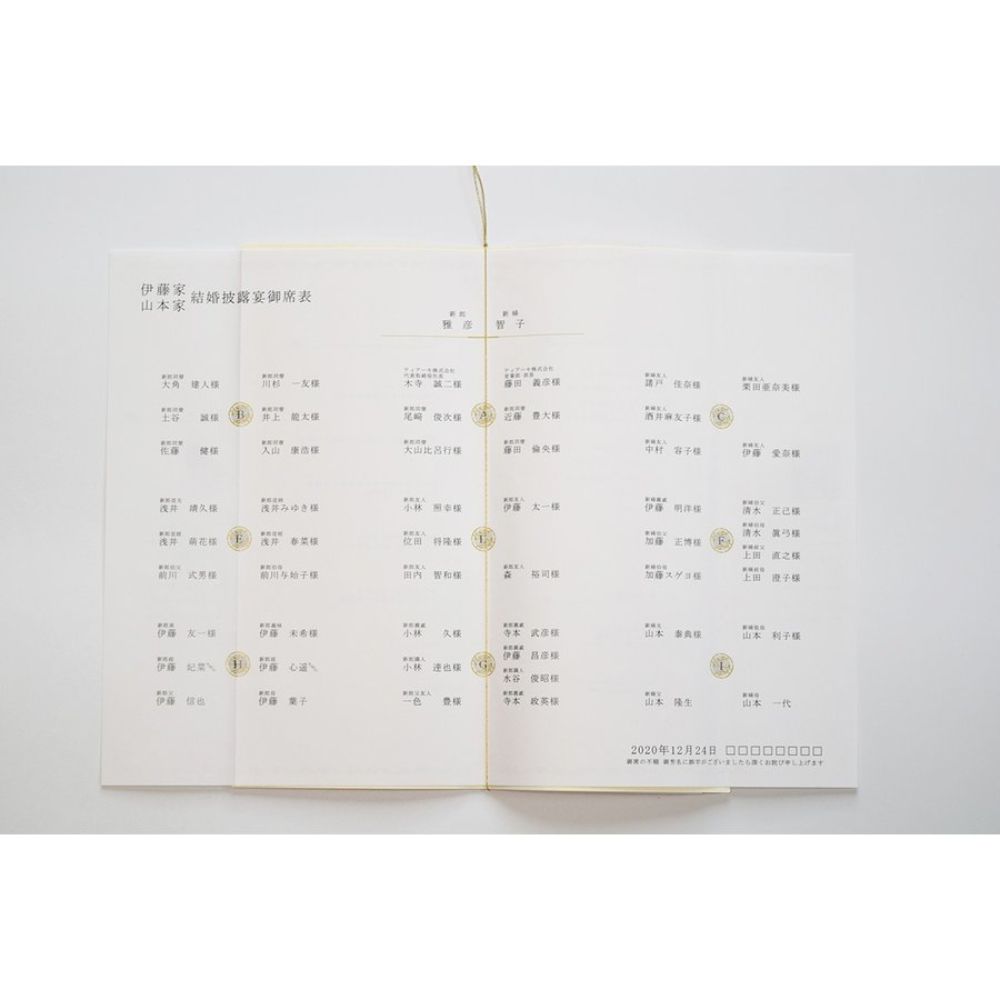 | 印刷備考 | 表面…席次表 裏面…挨拶・新居案内・メニュー・プロフィール(写真有) |