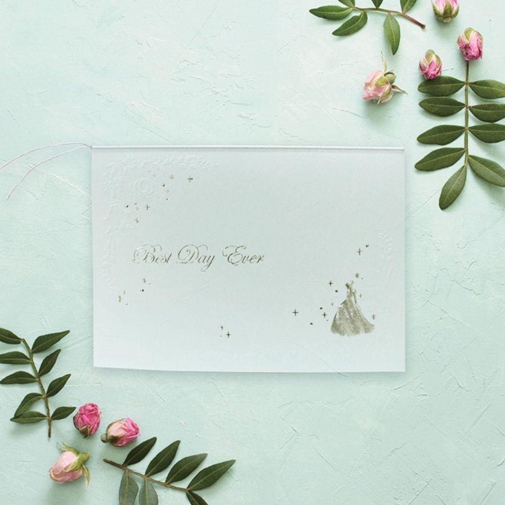 「Best Day Ever(人生で最高の一日)」とシンデレラのシルエットがシルバーの厚みのある箔押しを施し、全体をオシャレにまとめたデザインとなっております。