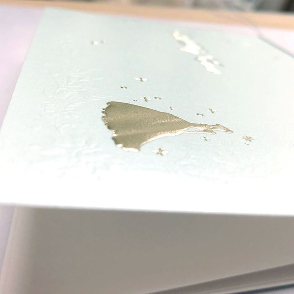 厚みの銀の箔押しはオシャレ感だけでなく、高級感も感じさせます。ディズニープリンセスの中で人気のシンデレラをモチーフにしており、さりげないかぼちゃの馬車の型押し加工や裏面のガラスの靴の加工がGood!