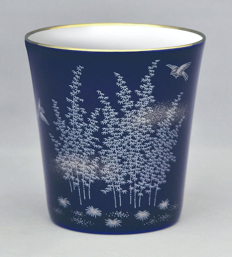 クラシカルな図柄をモチーフにしたフリーカップです。香蘭社を代表する瑠璃釉を全面に施し、その深く透明感のある空間に プラチナ彩を使い繊細なデザインで竹林が描かれています。微妙な色の違いだけで濃淡を出し、絶妙な色調で随所にぼかしをいれ 柔らかな深みを表現した竹林の図は 香蘭社の伝統的な文様のひとつで、多くの作品に見ることができます。
