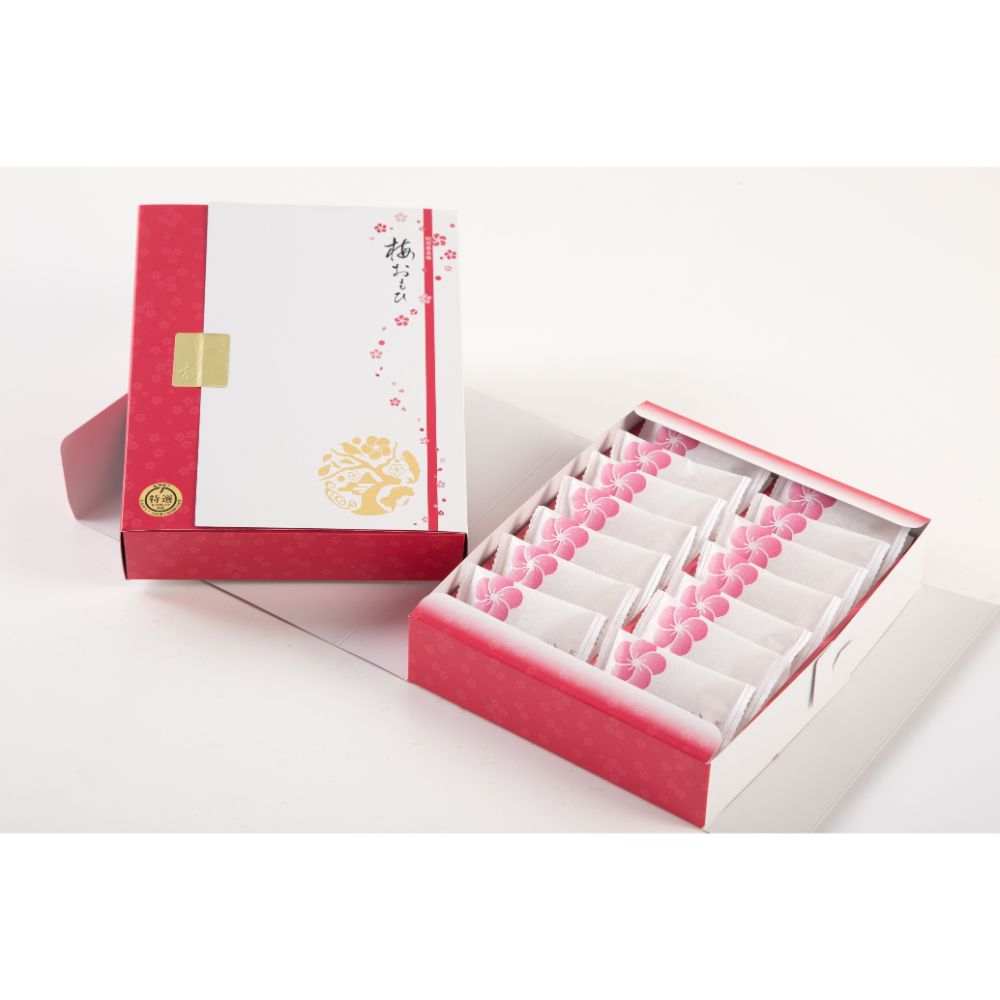 華やかな印象の中に上品さを兼ね備えたパッケージ。中身には梅をあしらったデザインの和紙に、最高品質のはちみつ仕立て(塩分約8%)梅干しが一粒一粒包まれています。プチギフトや縁起物にぴったりです。