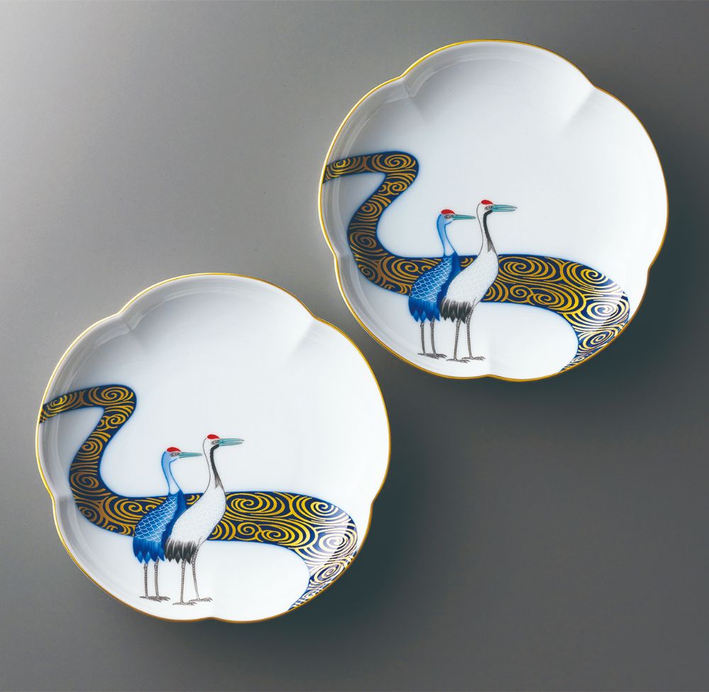 香蘭社 磁芸工房ブランドの組皿です。江戸時代に六曲屏風一双に描かれた尾形光琳の郡鶴図をモチーフにデザインされた 香蘭社調の気品良く仕上げた中皿です。縁起のよい鶴のデザインは、お祝いの贈り物にされても大変喜ばれる逸品です。