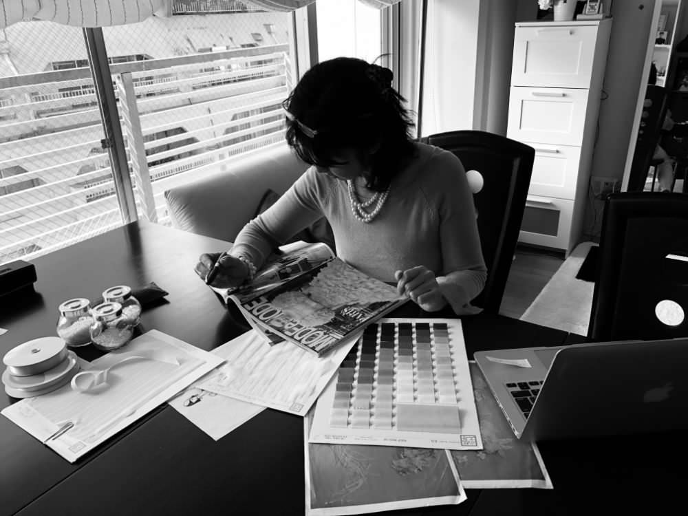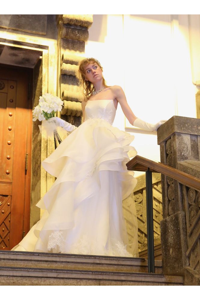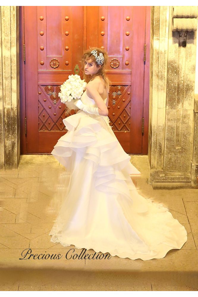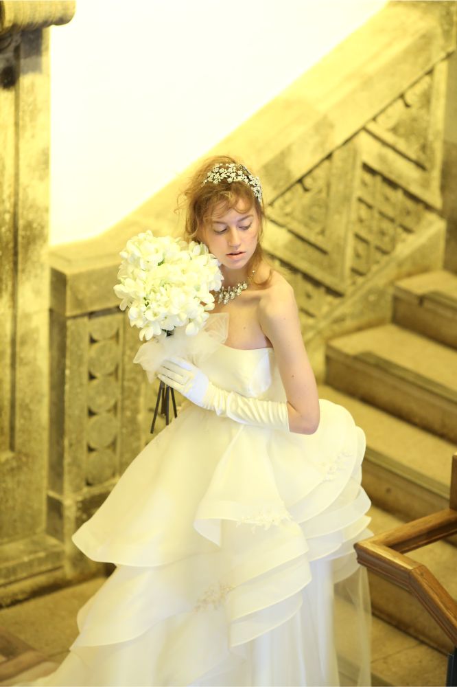 特許申請中の斬新な発想のドレスで、美しいシルエットを実現します。はりのあるホースヘアーを使ってアシンメトリーティアードを作り、軽やかな動きを作りました。360°どこから見ても表情の違う