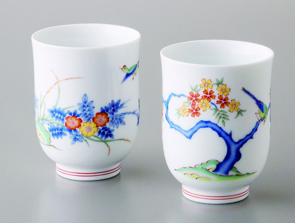 有田焼400年の歴史を代表する花鳥文様を、白磁に染付と上絵を配し、柿右衛門調に仕上げられたデザインの組湯呑です。