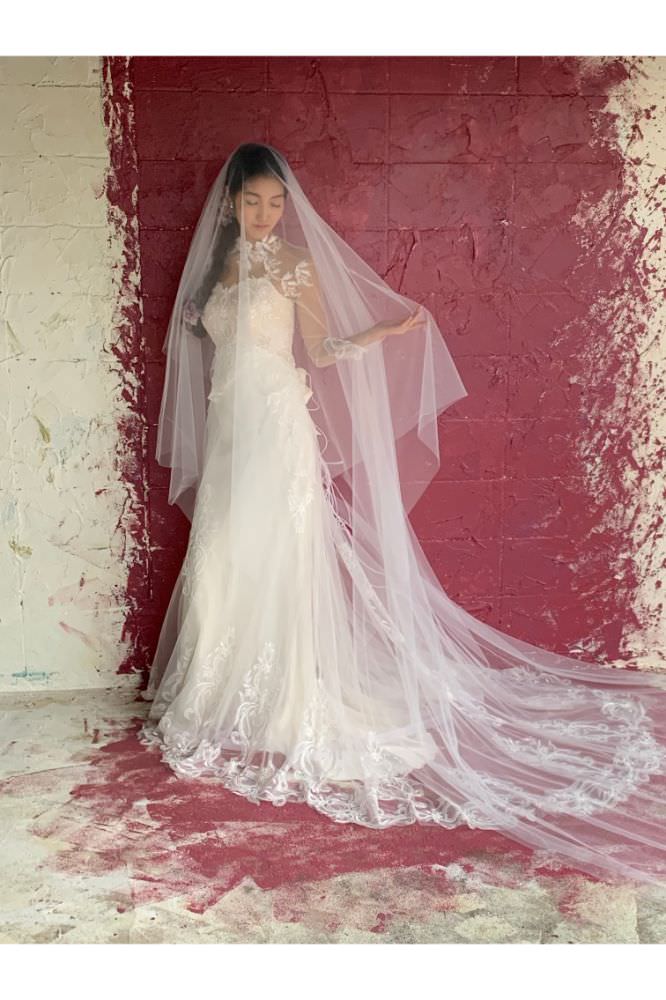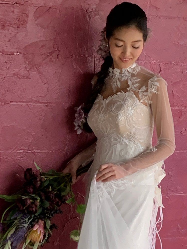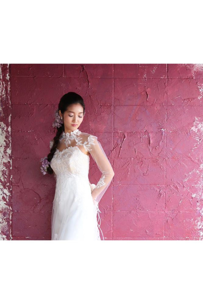 レースの持つ柔らかさをチュールにのせ、しっとりと流れるように表現した1着。
