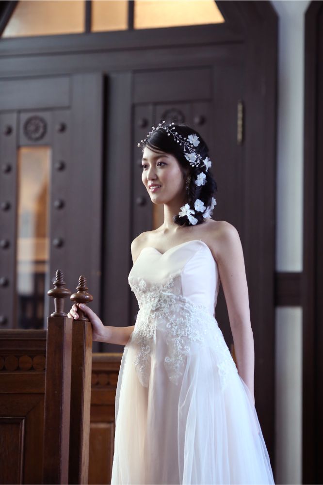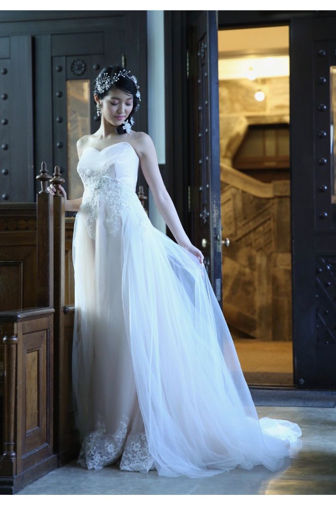 特許申請中の斬新な発想のドレスで、美しいシルエットを実現します。