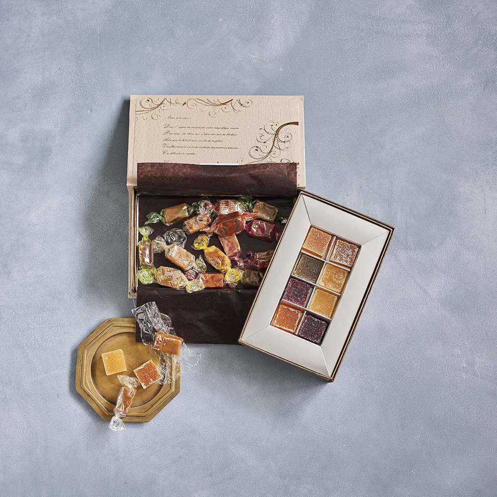 フランスのモンパリグルマン社より直輸入された「品質、製法、原材料」すべてにこだわり抜かれた伝統のお菓子【パート・ドゥ・フリュイ8粒】と【キャラメル16粒】を上下2層のスライド式パッケージにセットいたしました。