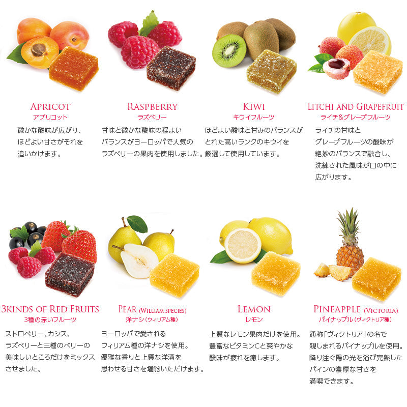 アプリコット、ラズベリー、キウイフルーツ、ライチ&グレープフルーツ、3種の赤いフルーツ、洋ナシ、レモン、パイナップル