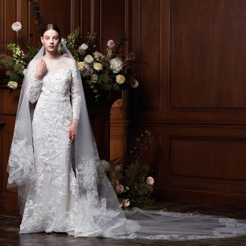 リーフの刺繍で彩られたロングスリーブデザインのマーメイドドレス。