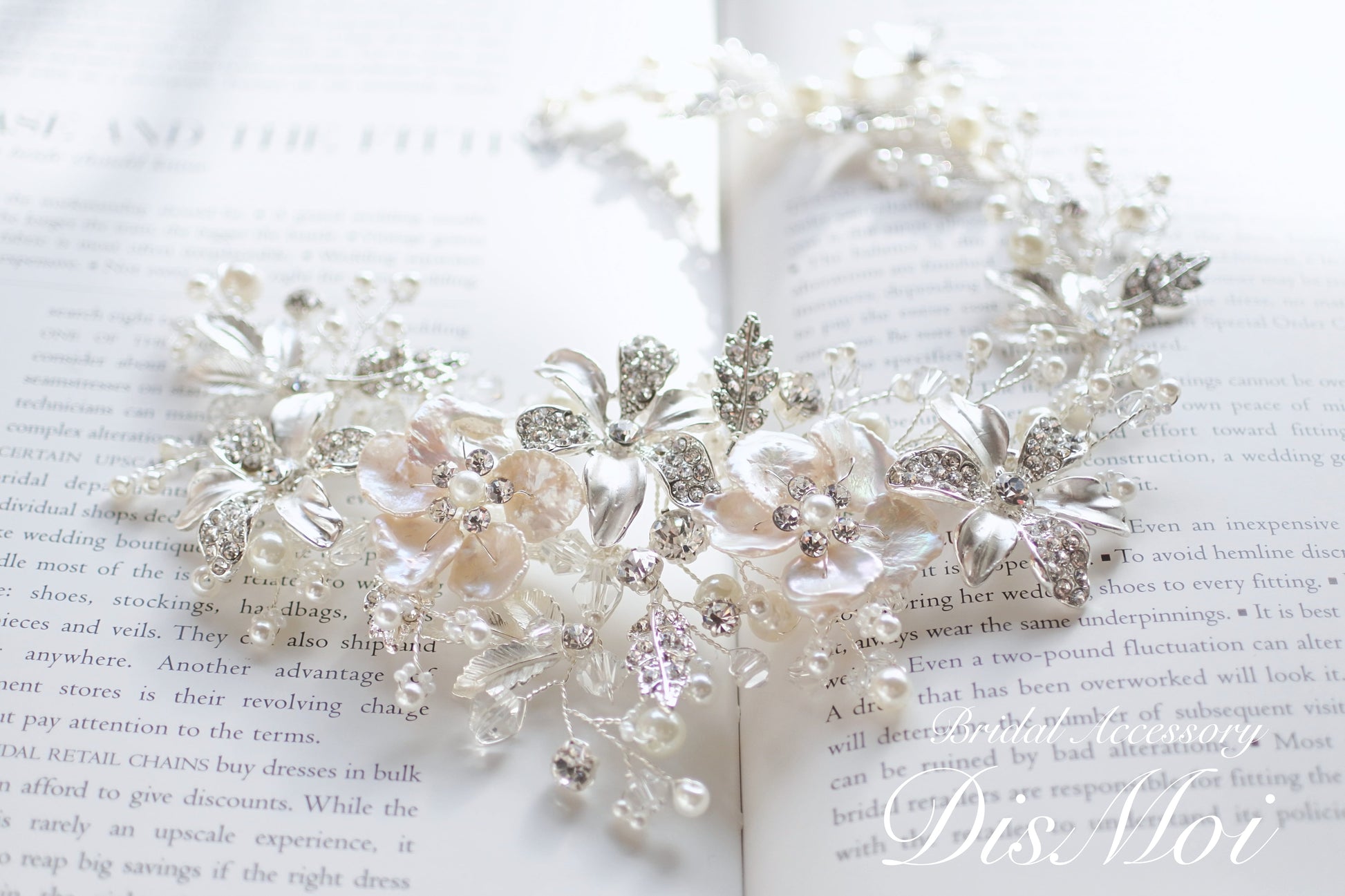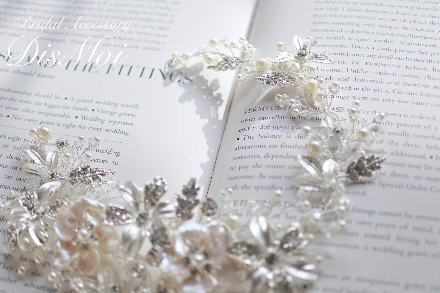 華奢なワイヤーに様々なパーツやパール、ビーズが編み込まれたブライダルシーンにピッタリのヘッドドレス。
