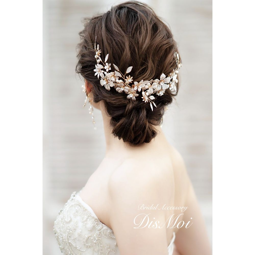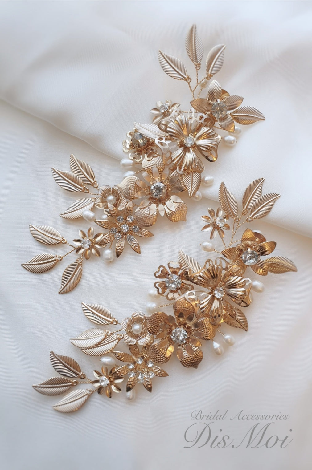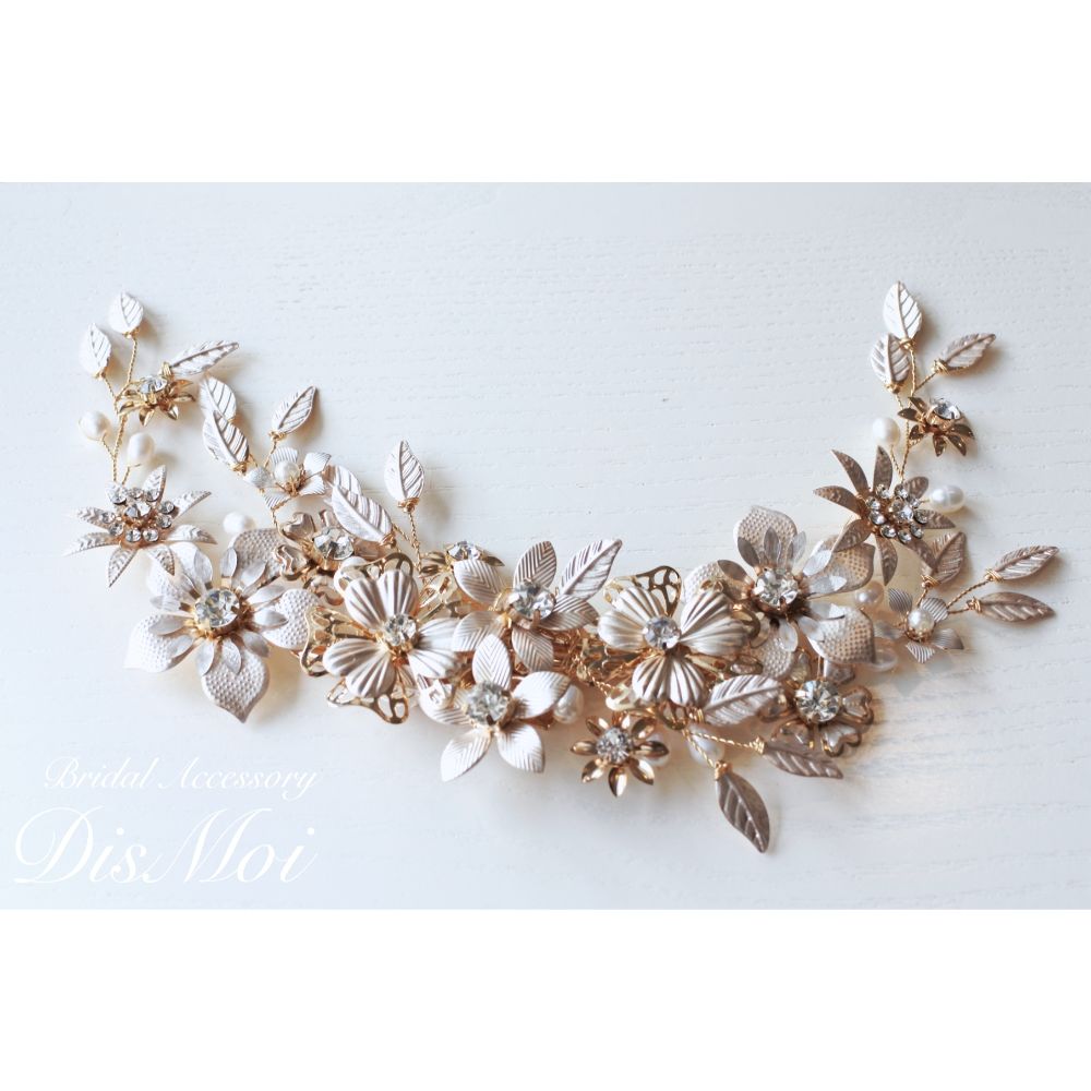 様々なデザインのフラワーモチーフとリーフモチーフが施されたゴールドカラーのヘッドピースです。