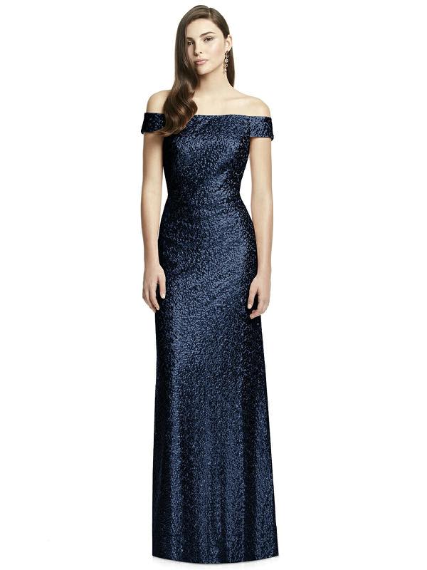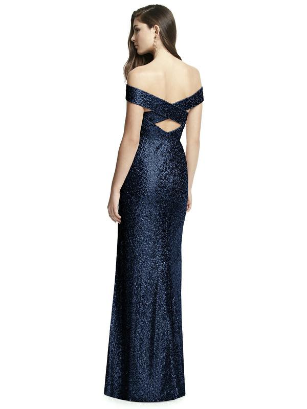 キラキラの光沢が美しい、スパンコール素材のオフショルダーロングドレス