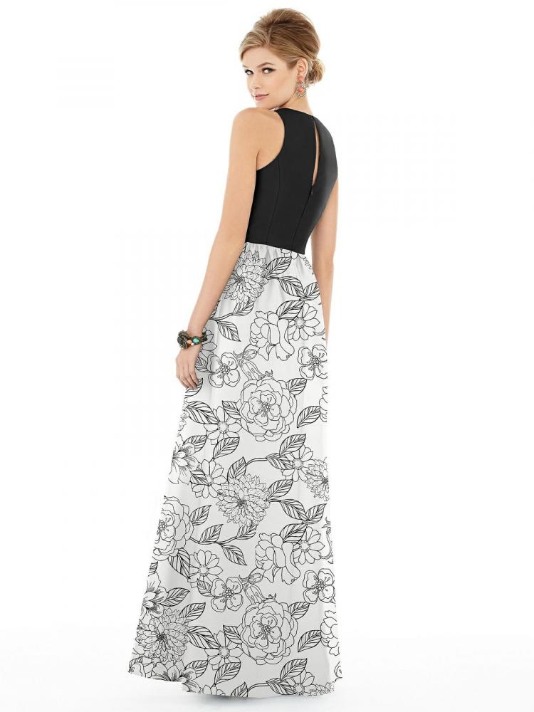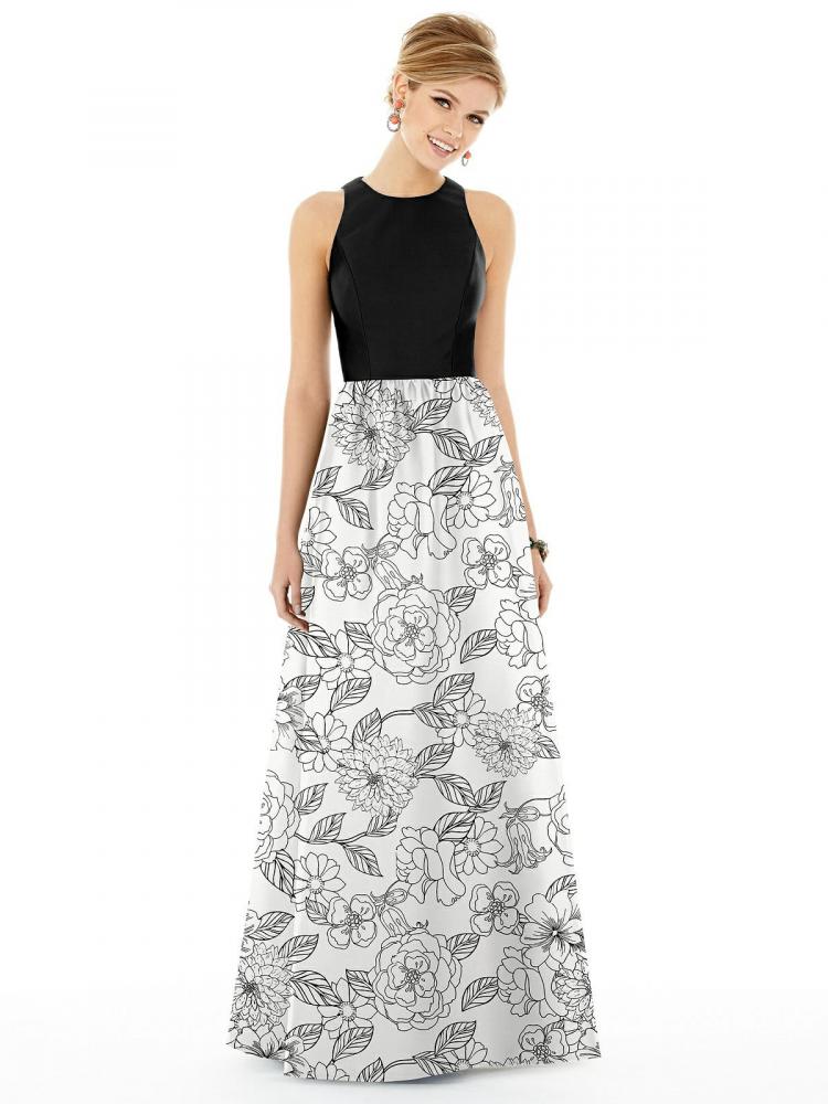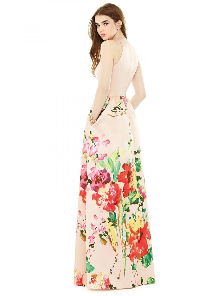 トップはシンプルな無地に花柄プリントのスカートが美しい、サテンツイルロングドレス
