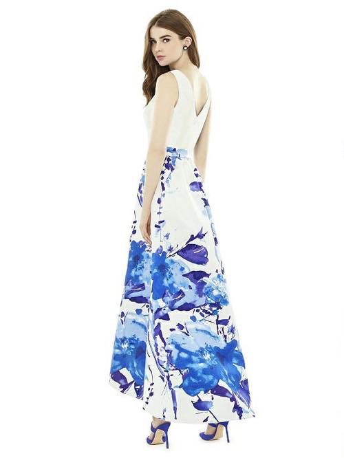 トップはシンプルな無地に花柄プリントのスカートが美しい、サテンツイルロングドレス