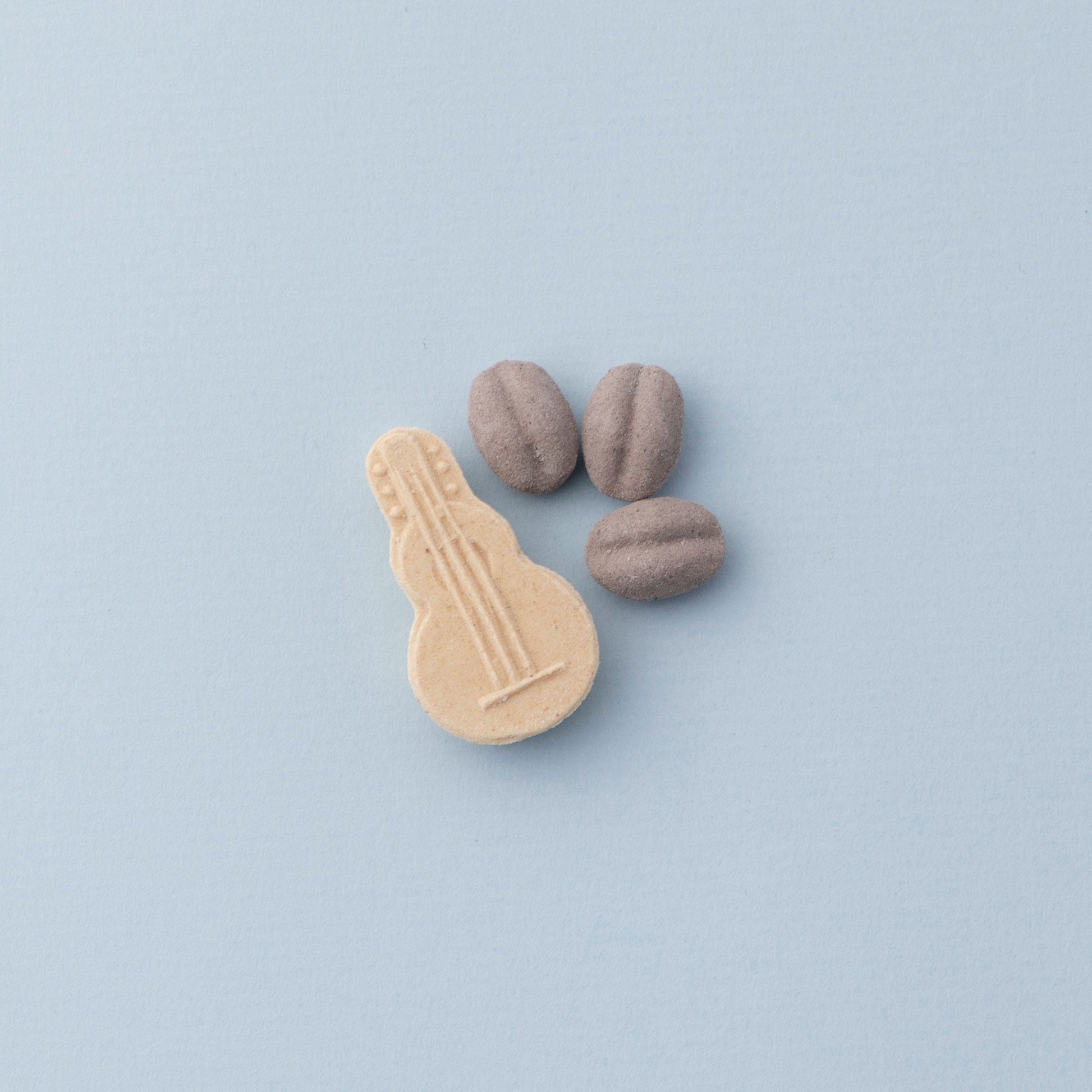 ギターはプレーン味、コーヒー豆はモカ味(和三盆&コーヒー&ブラックココア)に仕上げています。