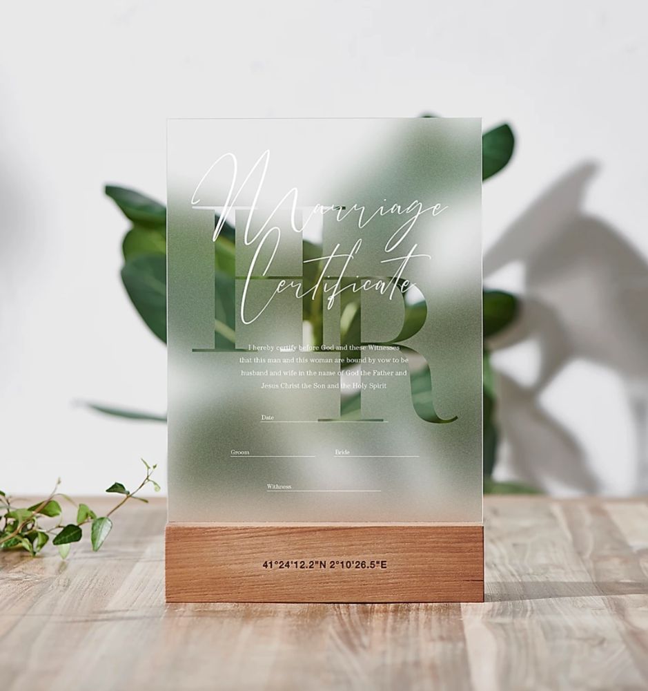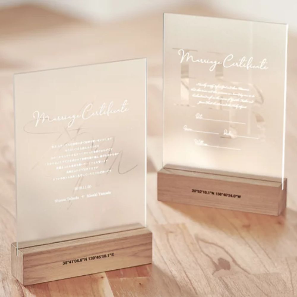 一生の大切な誓いをいつも目の届くところに。をコンセプトにインテリア性の高いデザインに仕上げられた結婚証明書。高級木材のチーク材を贅沢に土台に使用し、誓いの場所の緯度経度を刻印。一生変わる事のない数字を変わらぬ愛にかけてデザインされています。アクリル部分の誓いの言葉は、予め教会式用・人前式用をご用意。オリジナルの誓いの言葉もオプション(2200円)にて作成が可能です。
