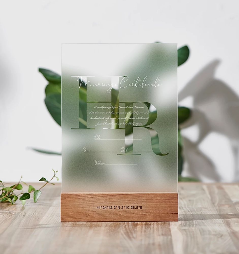 一生の大切な誓いをいつも目の届くところに。をコンセプトにインテリア性の高いデザインに仕上げられた結婚証明書。高級木材のチーク材を贅沢に土台に使用し、誓いの場所の緯度経度を刻印。一生変わる事のない数字を変わらぬ愛にかけてデザインされています。アクリル部分の誓いの言葉は、予め教会式用・人前式用をご用意。オリジナルの誓いの言葉もオプション(2200円)にて作成が可能です。