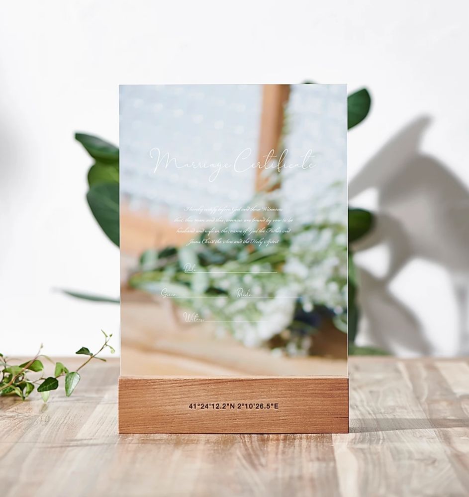 一生の大切な誓いをいつも目の届くところに。をコンセプトにインテリア性の高いデザインに仕上げられた結婚証明書。高級木材のチーク材を贅沢に土台に使用し、誓いの場所の緯度経度を刻印。一生変わる事のない数字を変わらぬ愛にかけてデザインされています。アクリル部分の誓いの言葉は、予め教会式用・人前式用をご用意。オリジナルの誓いの言葉もオプション(2200円)にて作成が可能です。