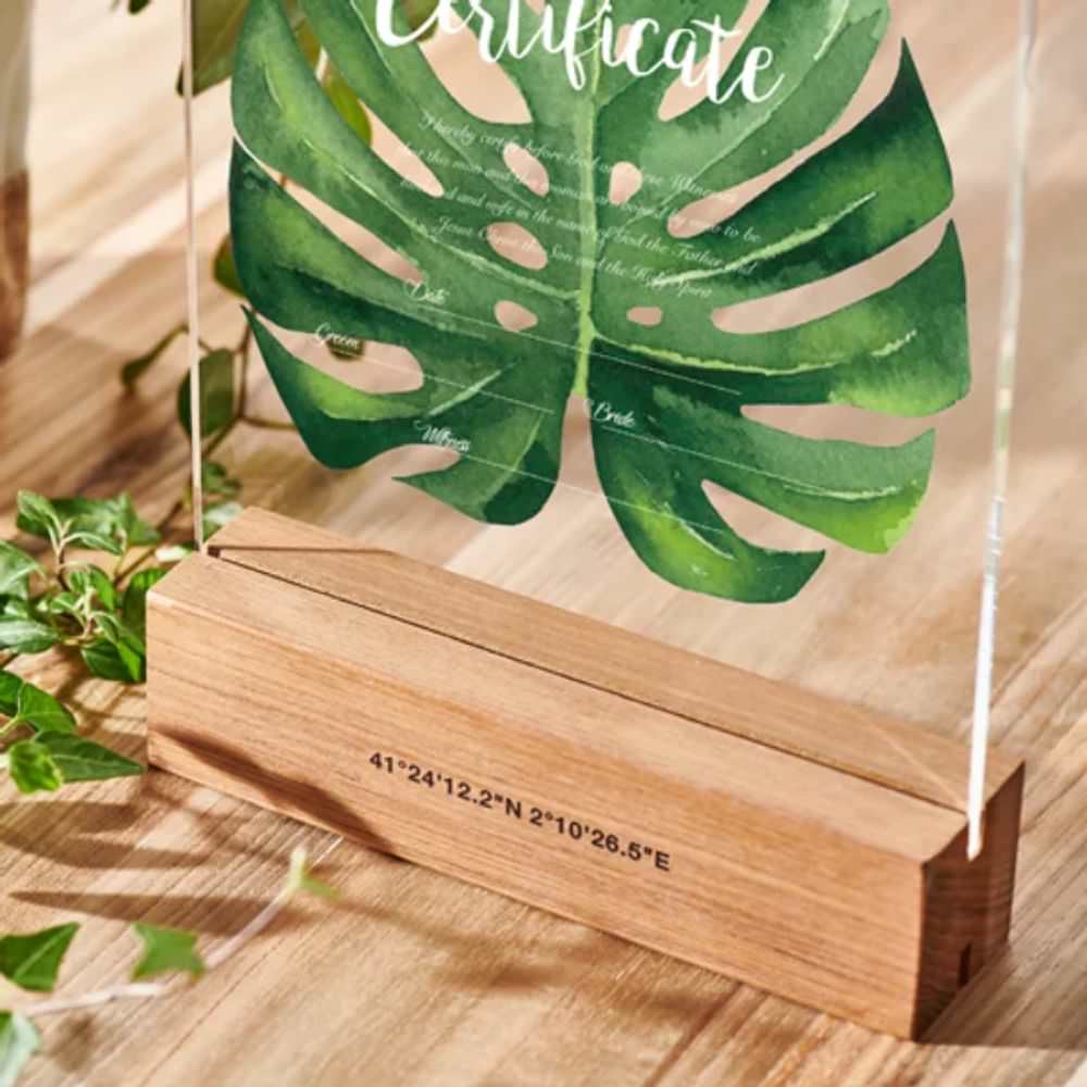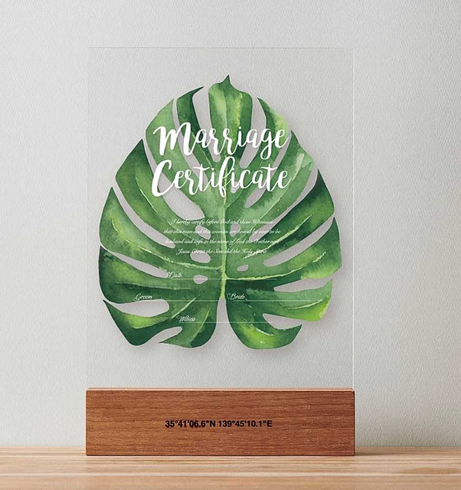 一生の大切な誓いをいつも目の届くところに。をコンセプトにインテリア性の高いデザインに仕上げられた結婚証明書。高級木材のチーク材を贅沢に土台に使用し、誓いの場所の緯度経度を刻印。一生変わる事のない数字を変わらぬ愛にかけてデザインされています。アクリル部分の誓いの言葉は、予め教会式用・人前式用をご用意。オリジナルの誓いの言葉もオプション(2200円)にて作成が可能です。