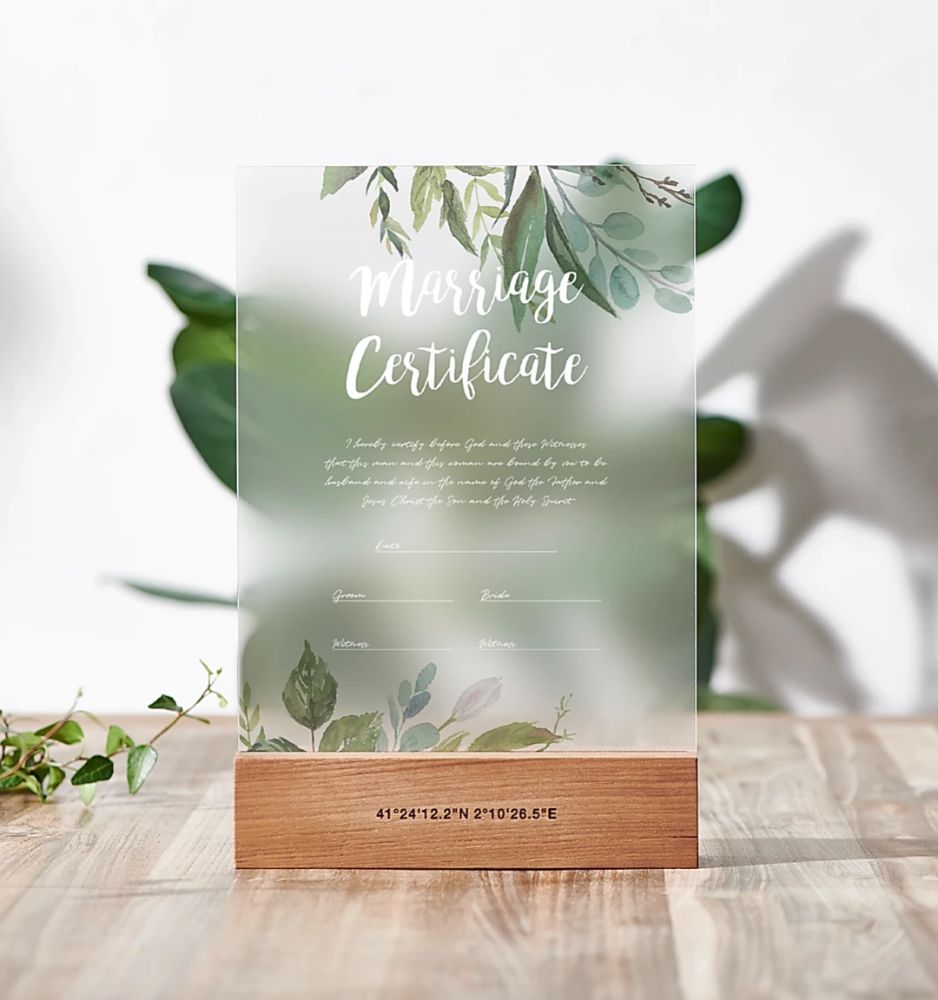 一生の大切な誓いをいつも目の届くところに。をコンセプトにインテリア性の高いデザインに仕上げられた結婚証明書。高級木材のチーク材を贅沢に土台に使用し、誓いの場所の緯度経度を刻印。一生変わる事のない数字を変わらぬ愛にかけてデザインされています。アクリル部分の誓いの言葉は、予め教会式用・人前式用をご用意。オリジナルの誓いの言葉もオプション(2200円)にて作成が可能です。