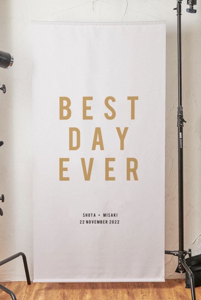 高さ180cm×幅90cmと大きなタペストリーは 高砂や受付のバックに飾る事で、 コーナーの雰囲気を手軽に変えれる優れもの。 またフォトスポットの背景として使ったりと マルチに使えるアイテムです。