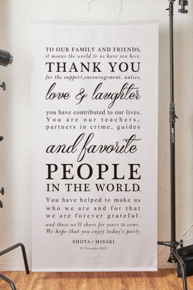 高さ180cm×幅90cmと大きなタペストリーは 高砂や受付のバックに飾る事で、 コーナーの雰囲気を手軽に変えれる優れもの。 またフォトスポットの背景として使ったりと マルチに使えるアイテムです。
